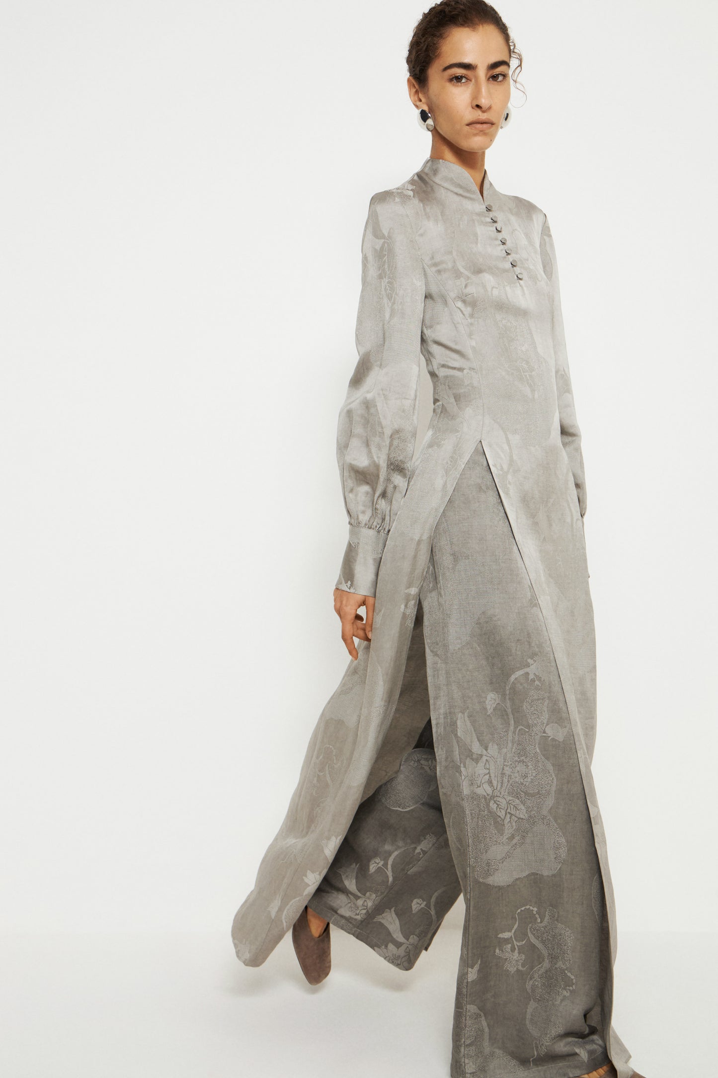 Loose-fit trousers in a jacquard weave made from viscose, linen and cotton blend. Featuring a concealed zip and hook-and-eye fastener at one side of the waist. Wide legs.