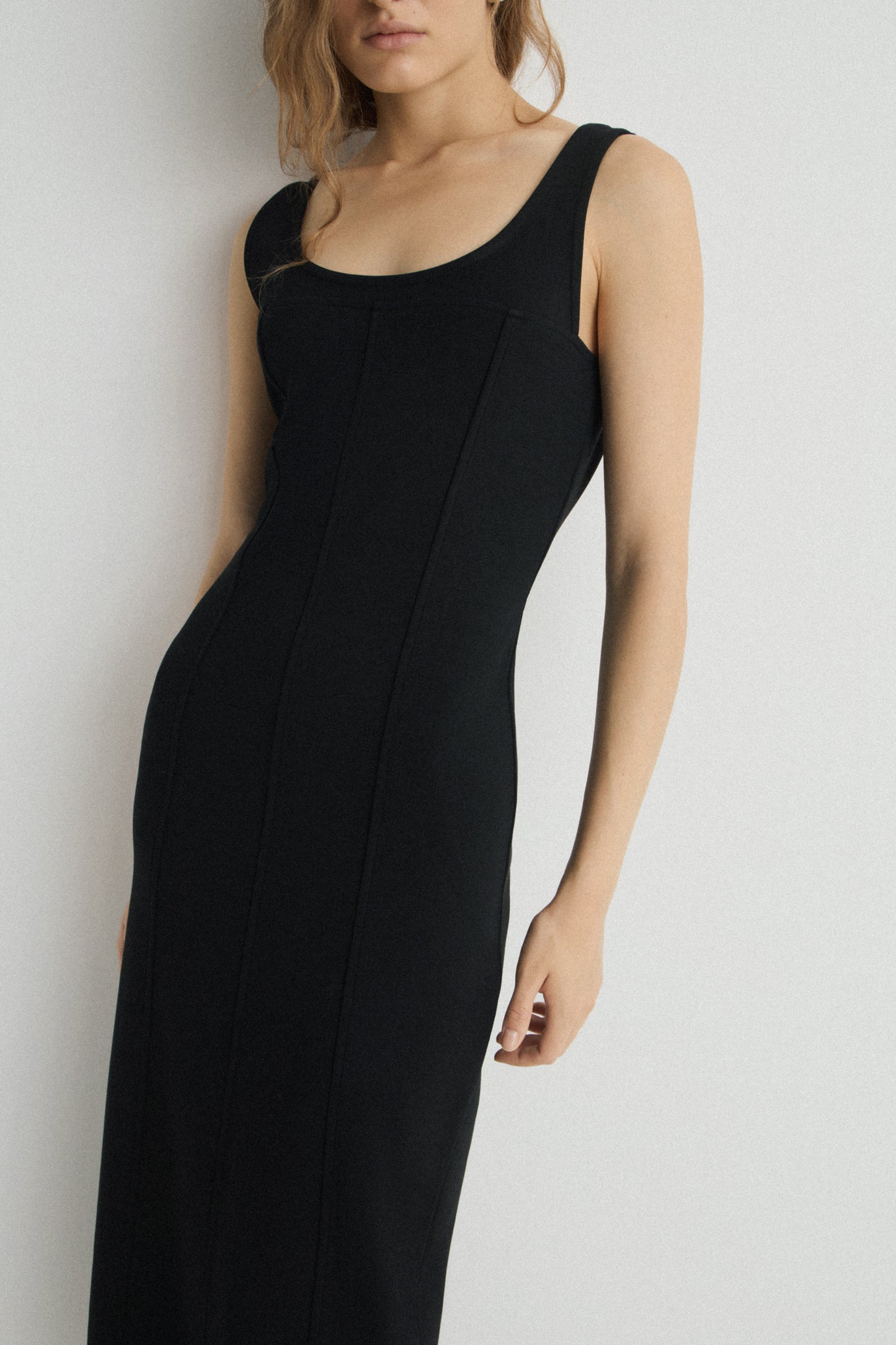 Stretchy maxi dress with a firm sculpting effect. Designed with visible seams for provide medium support and wide shoulder straps.