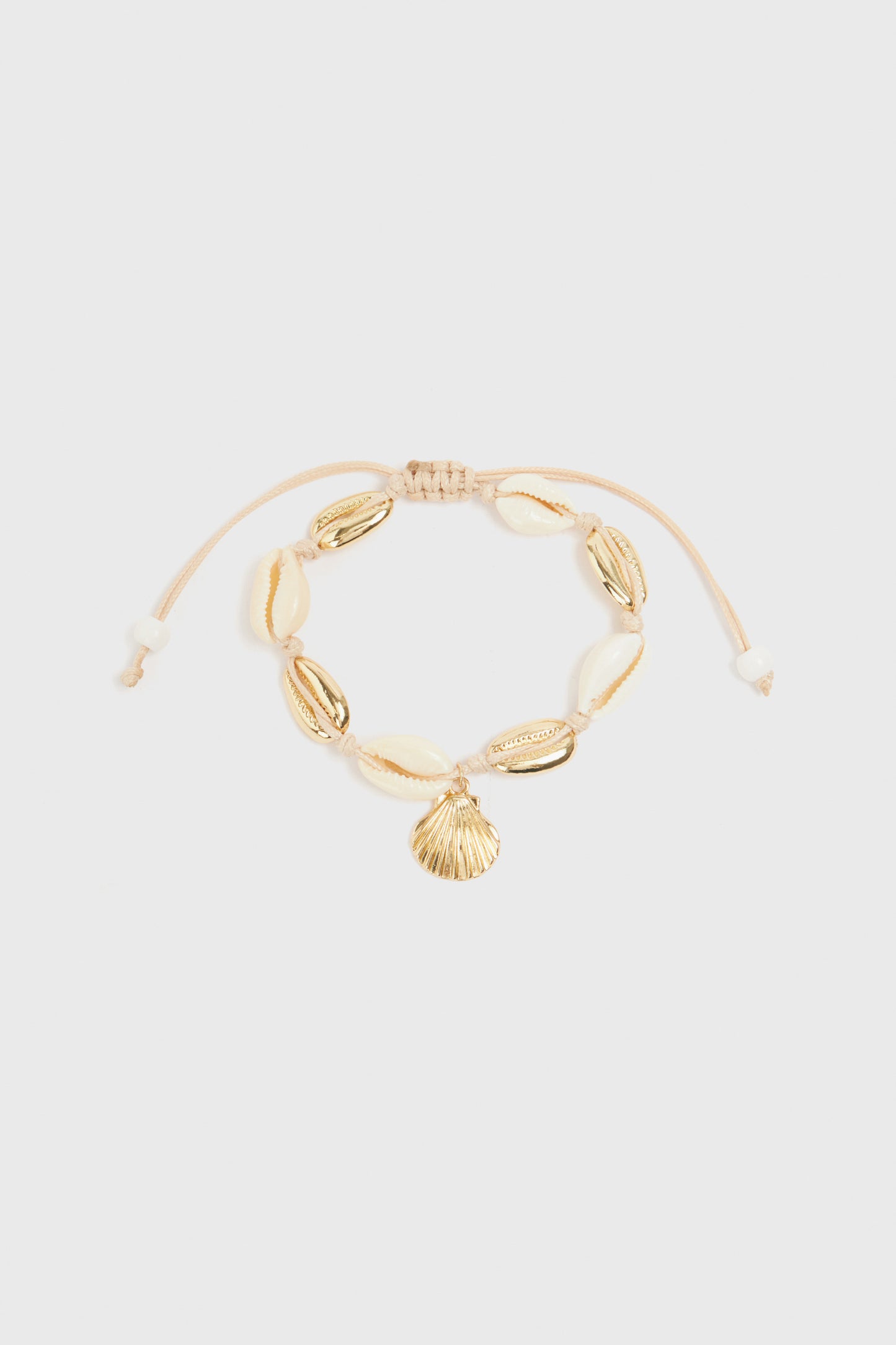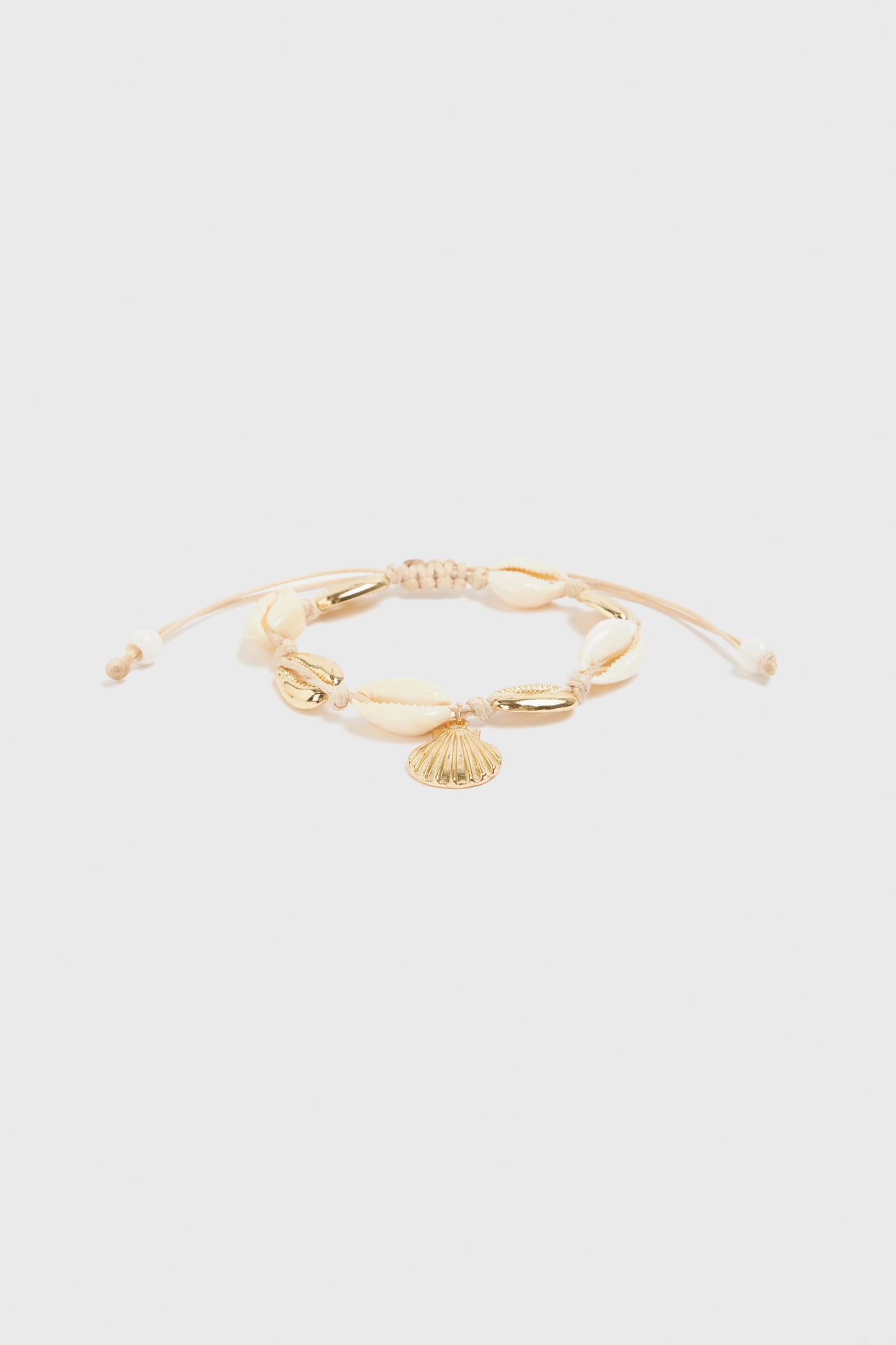 Cord anklet detailed with knot fastening and plastic seashell-shaped beads.