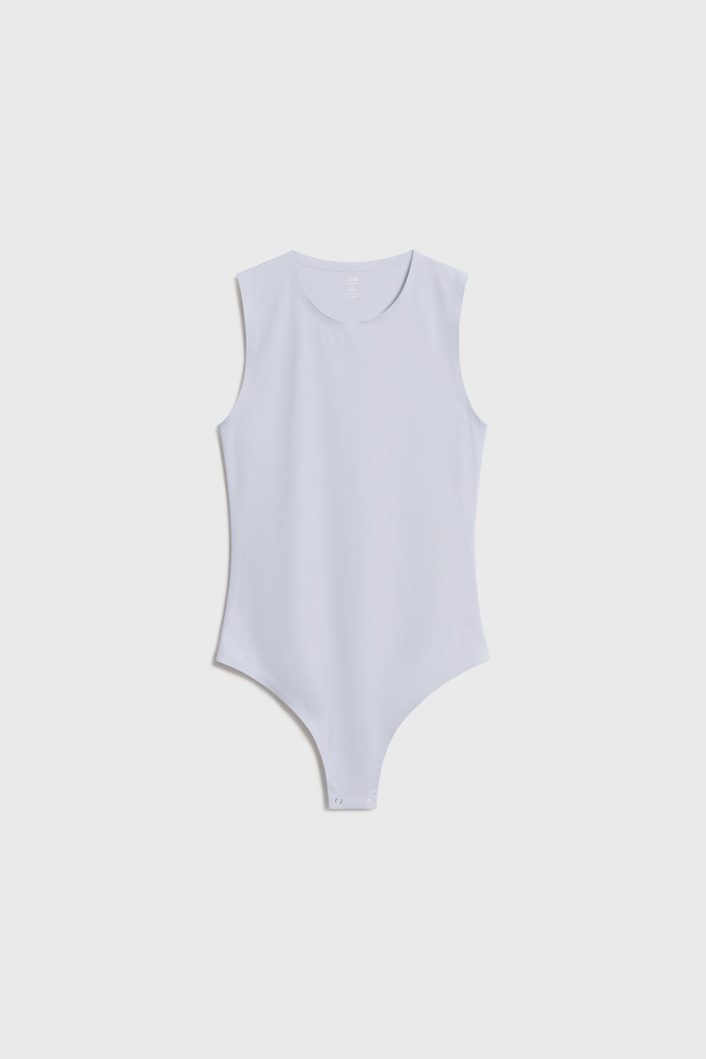 Microfibre sleeveless bodysuit with round neck and snap-button fastening at the bottom.