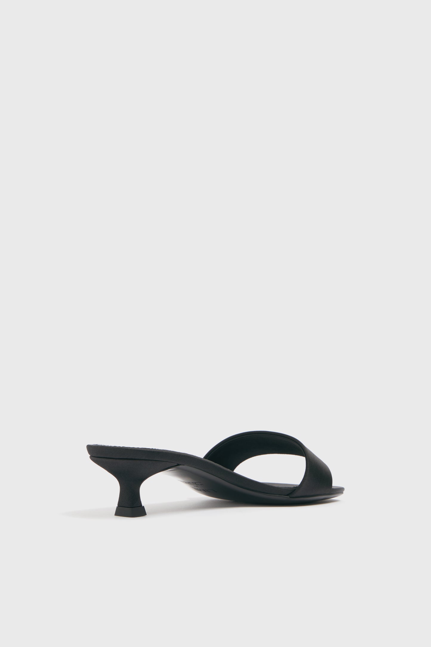 These kitten-heel modern sandals are crafted from leather and satin fabric. Wide foot strap and leather insoles. Your purchases are delivered with a fabric bag.