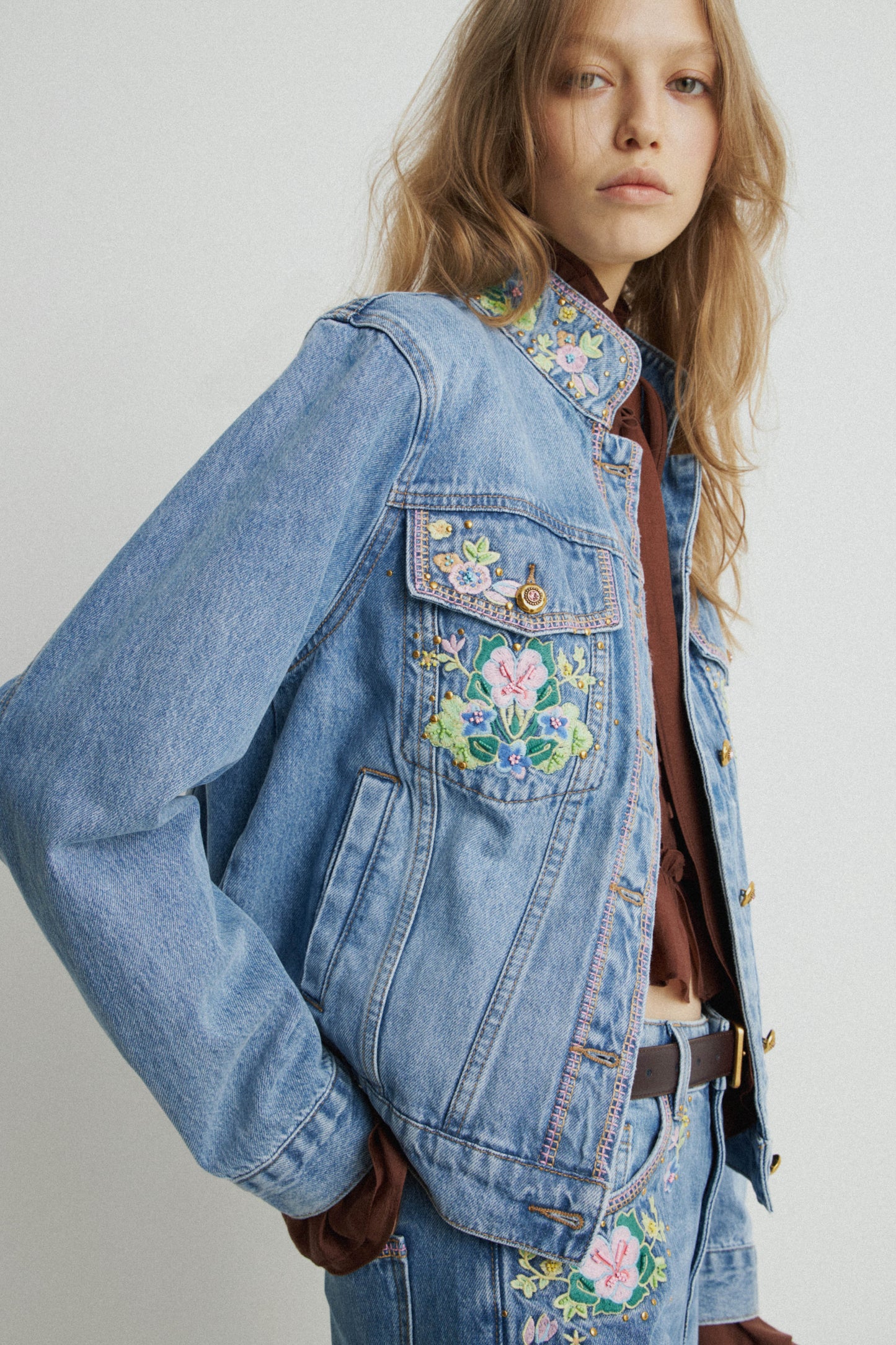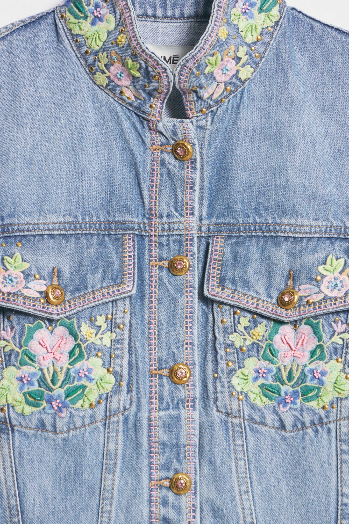 Collared jacket in sturdy cotton denim with long cuffed sleeves. Decorated with an embroidered motif and gold-tone buttons. Featuring front welt pockets, patch pockets with buttoned flaps on the chest. An adjustable tab with snap-buttons at the sides of the waist.