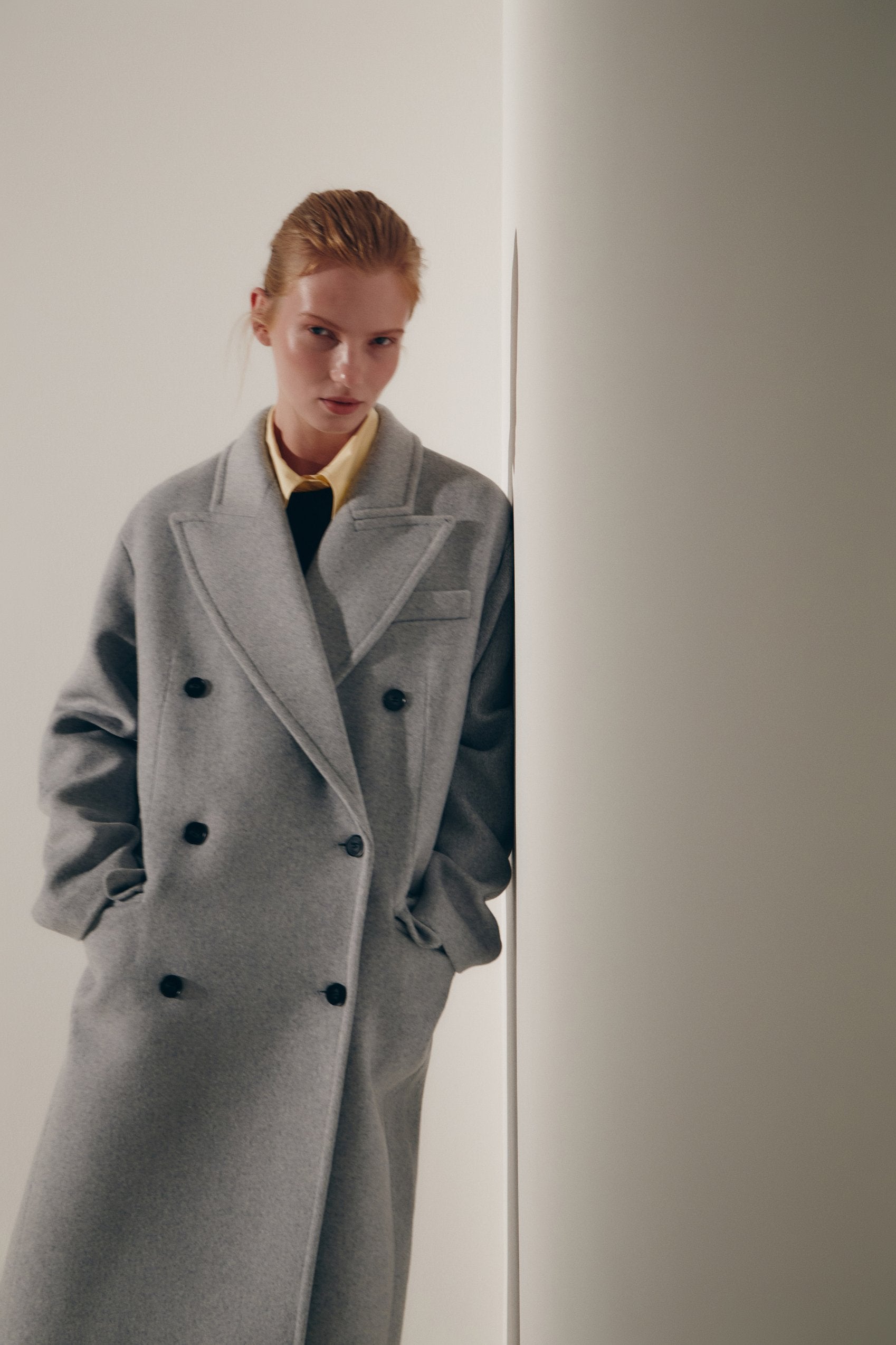 Double-breasted coat with a lapel collar and long sleeves made of wool blend. Featuring front flap pockets and chest welt pocket. Matching lining. Front button fastening. Straight fit silhouette.