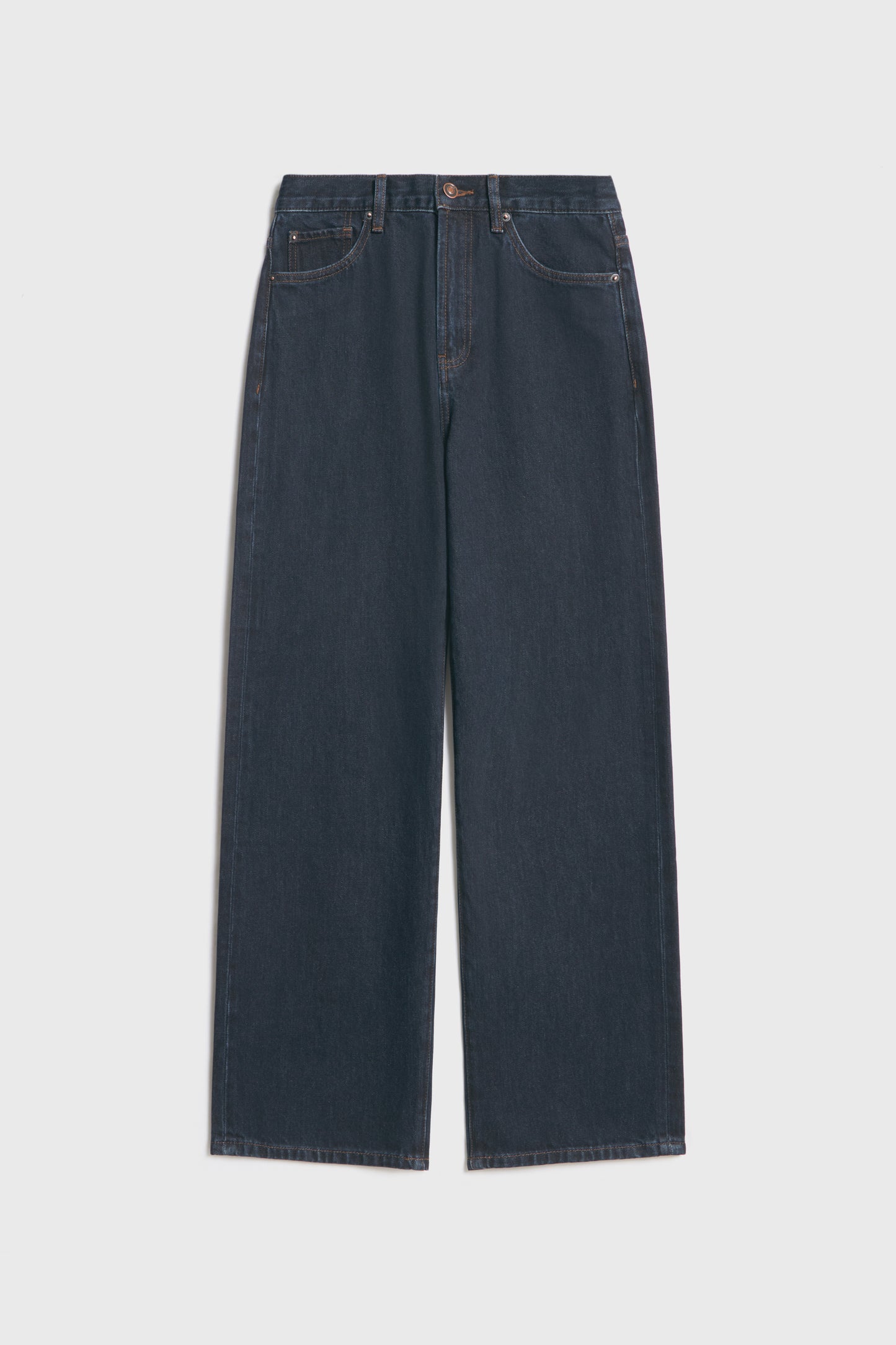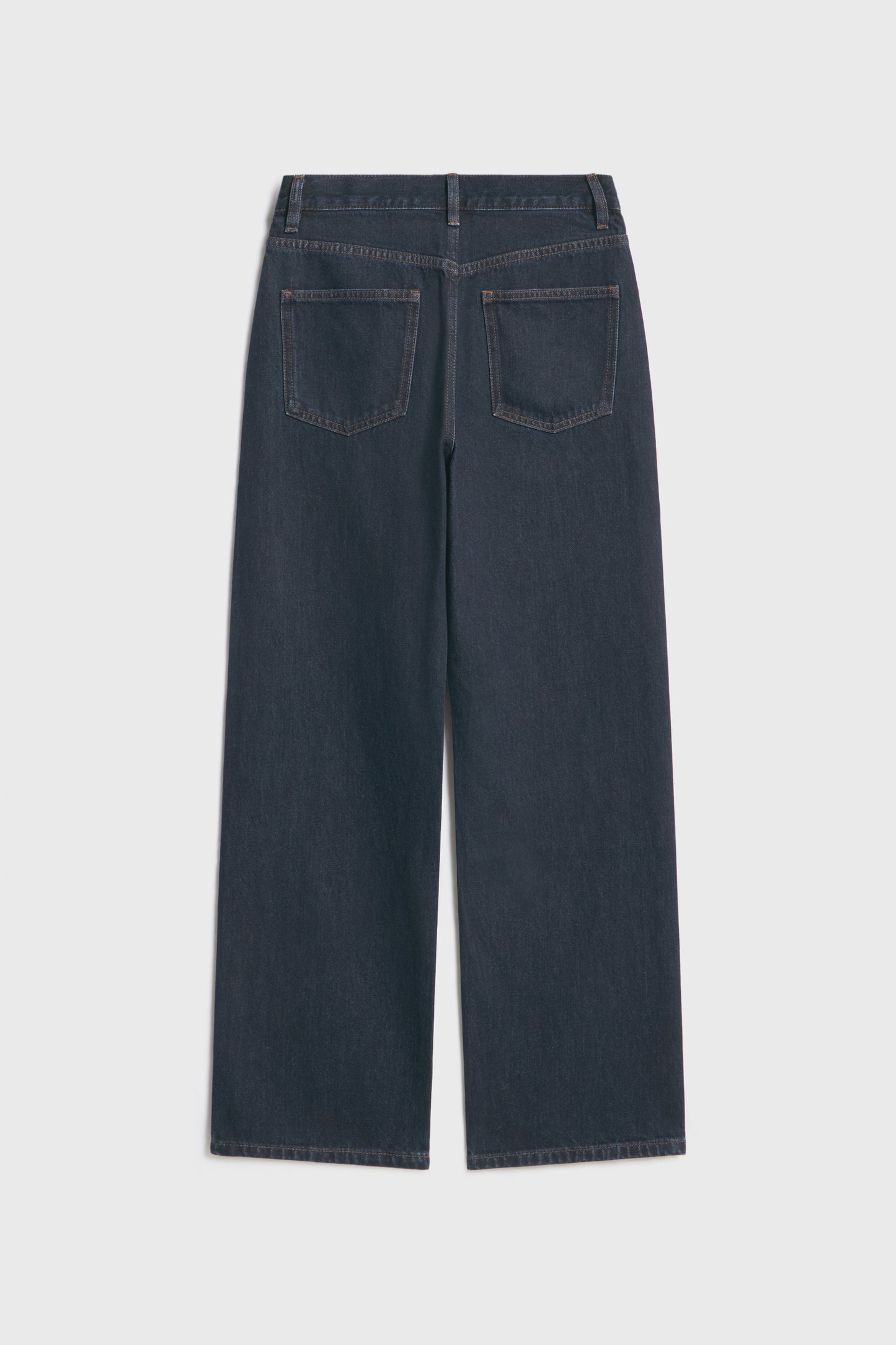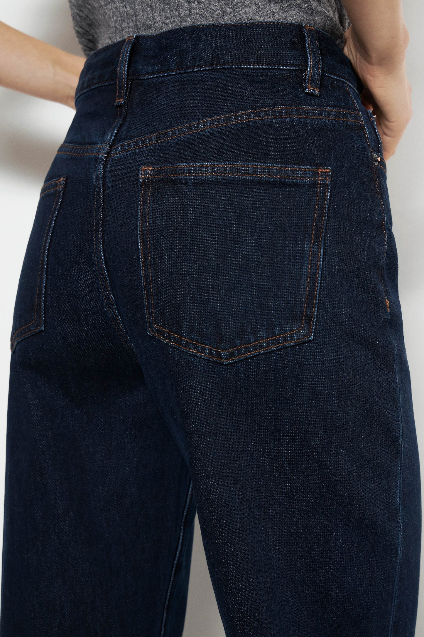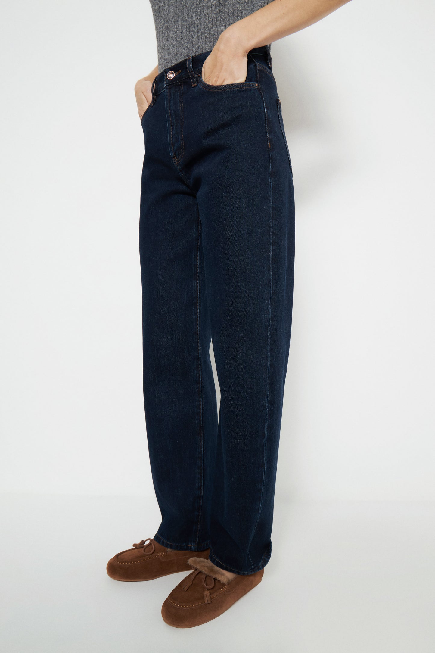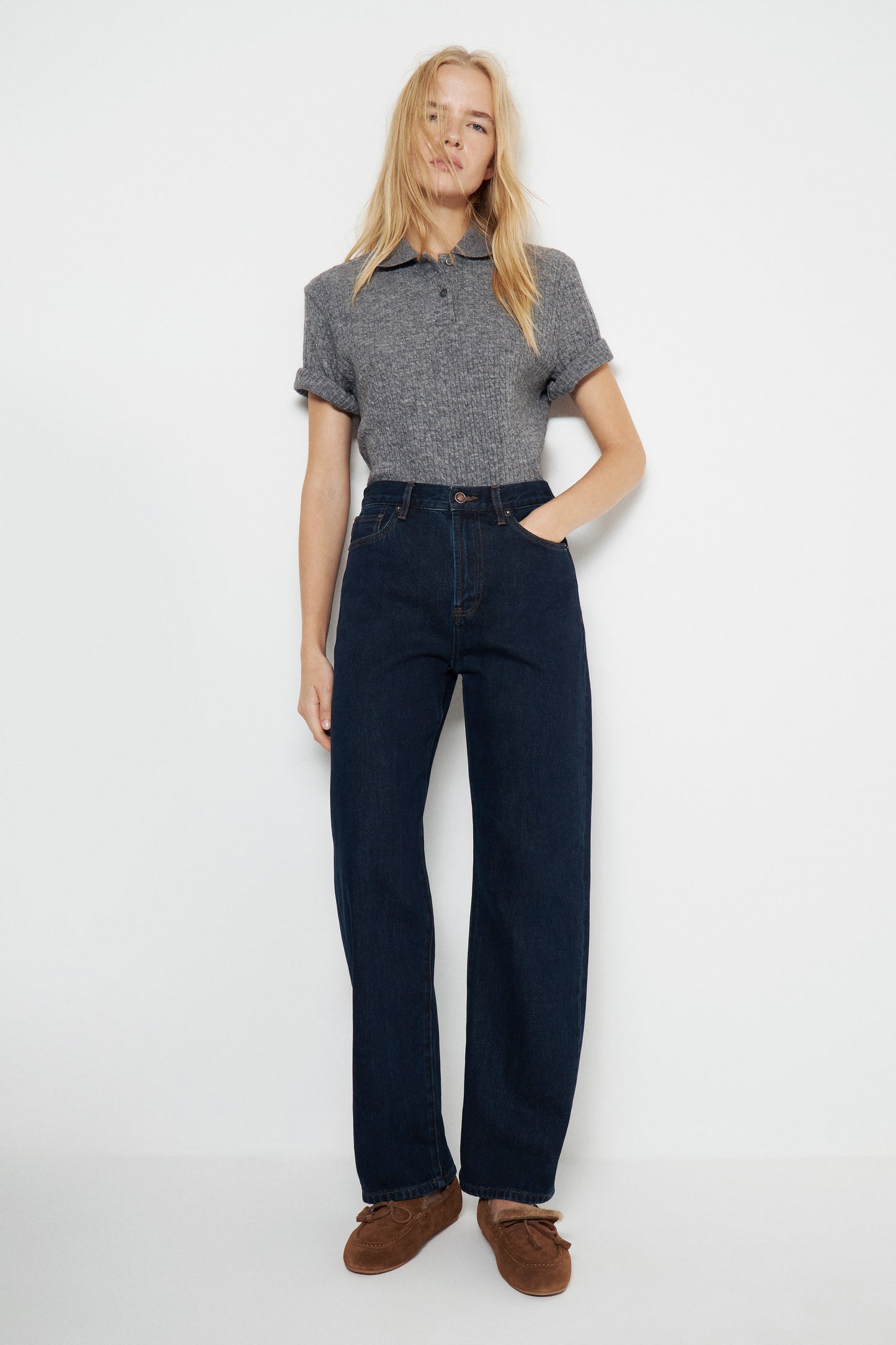 High-waist jeans with five pockets. Straight-leg design. Front button fastening.