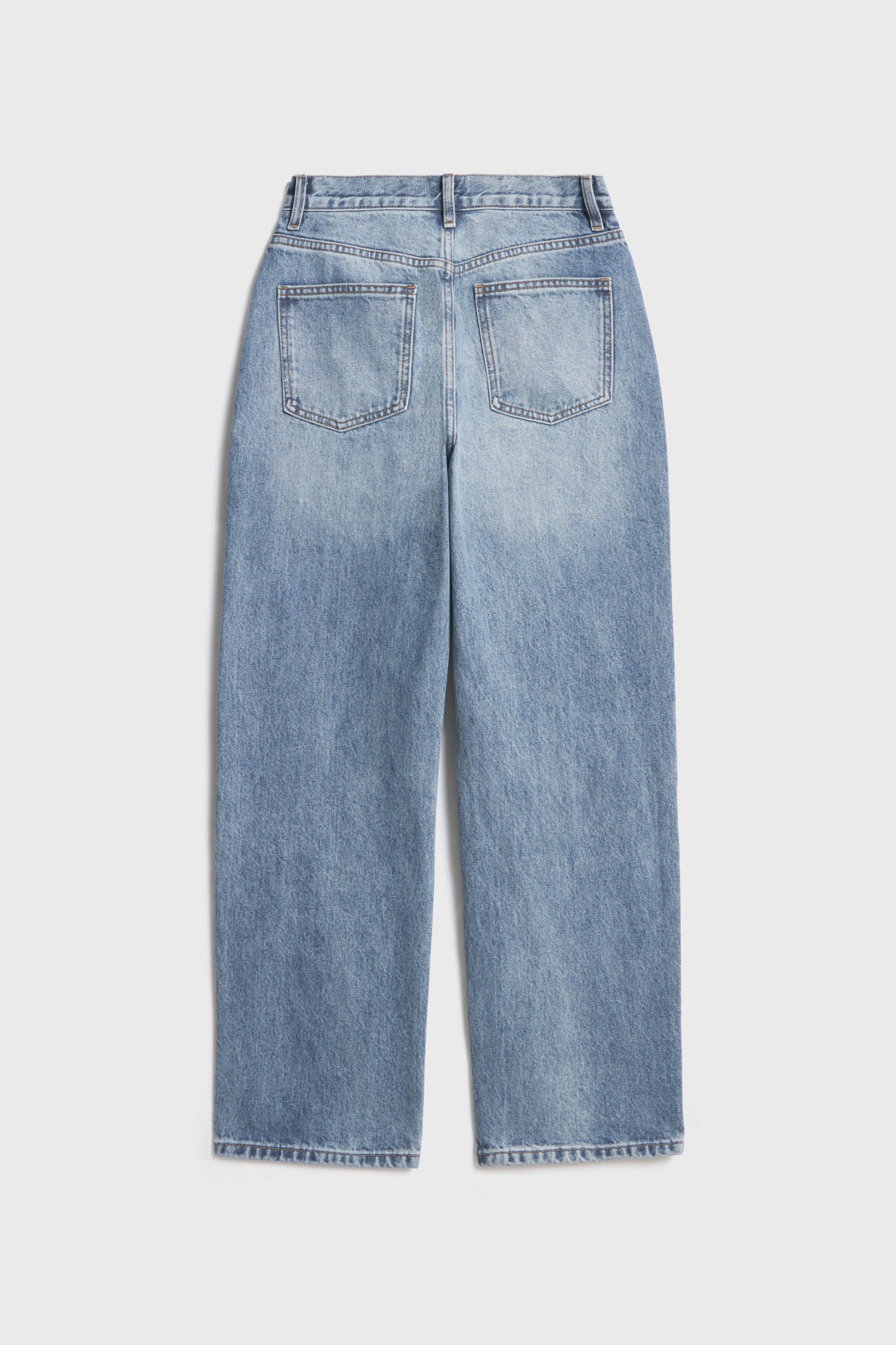 High-waist jeans with five pockets. Straight-leg design. Front zip and metal button closure.