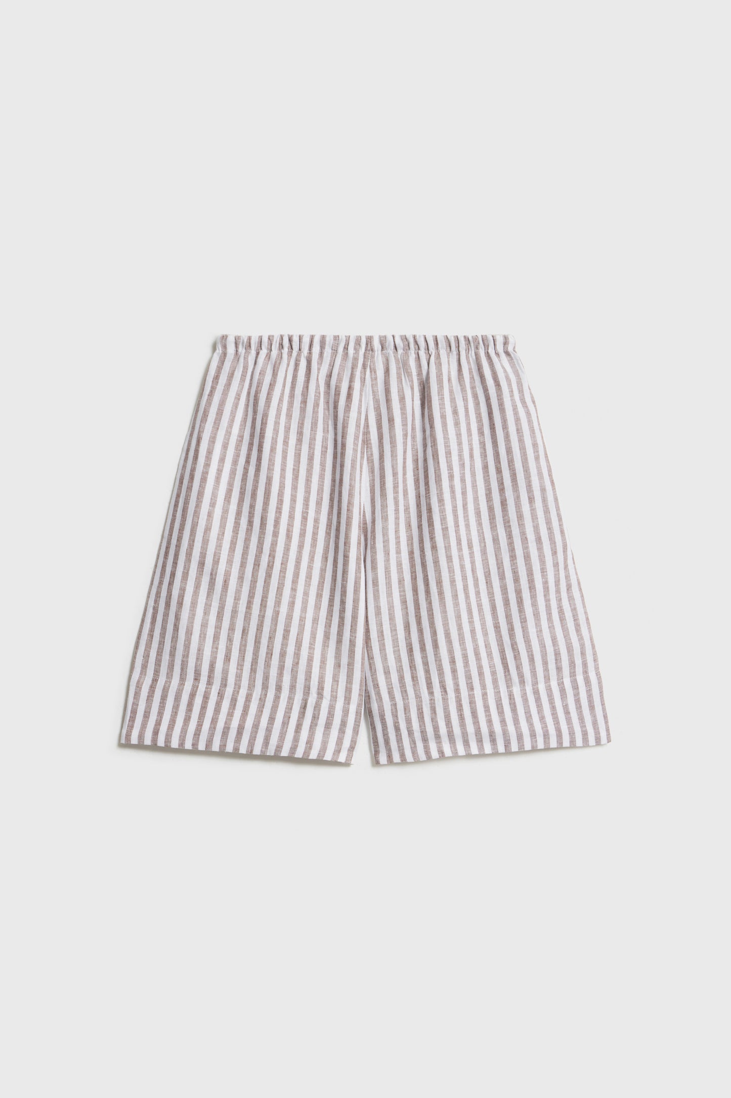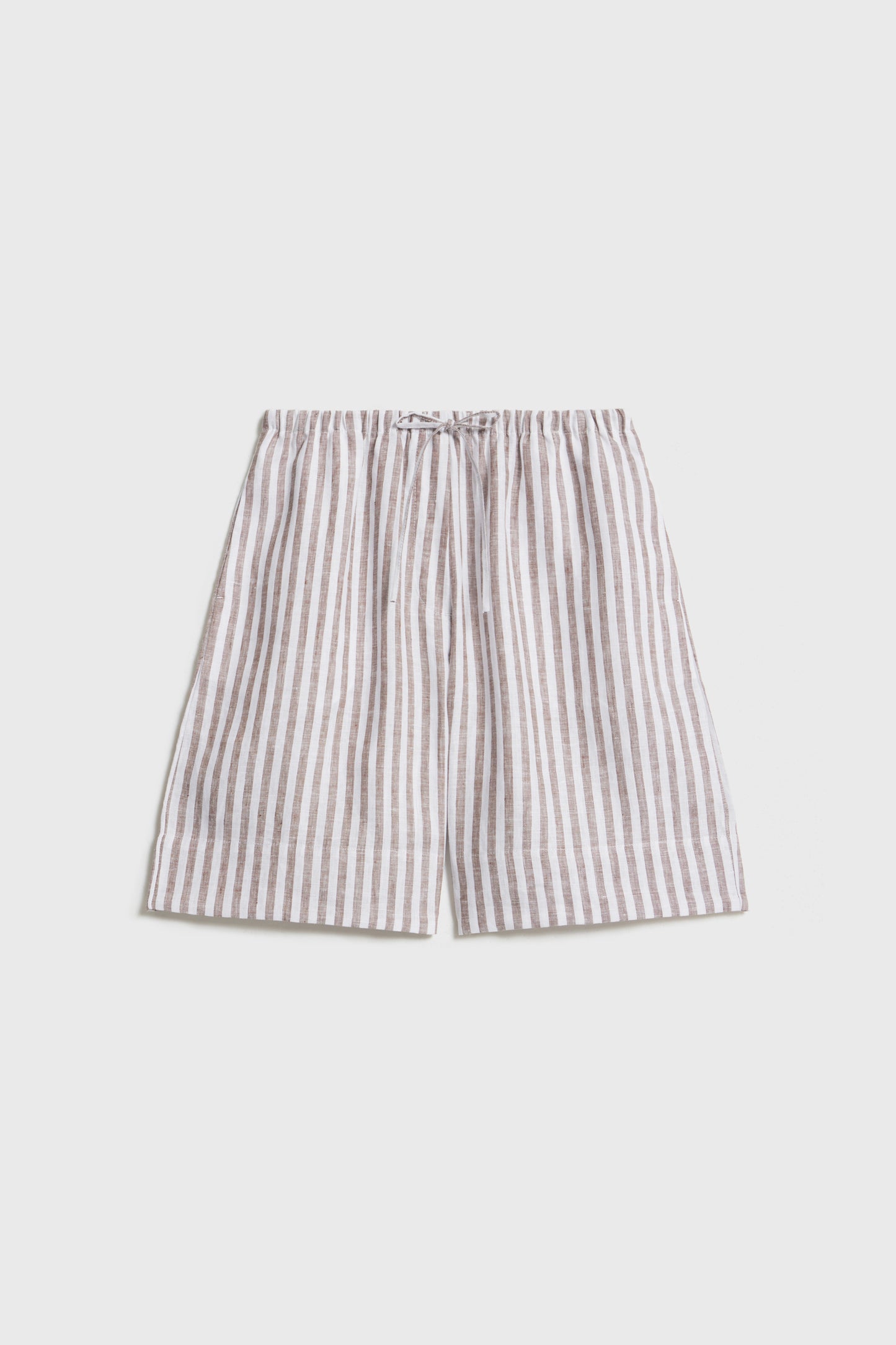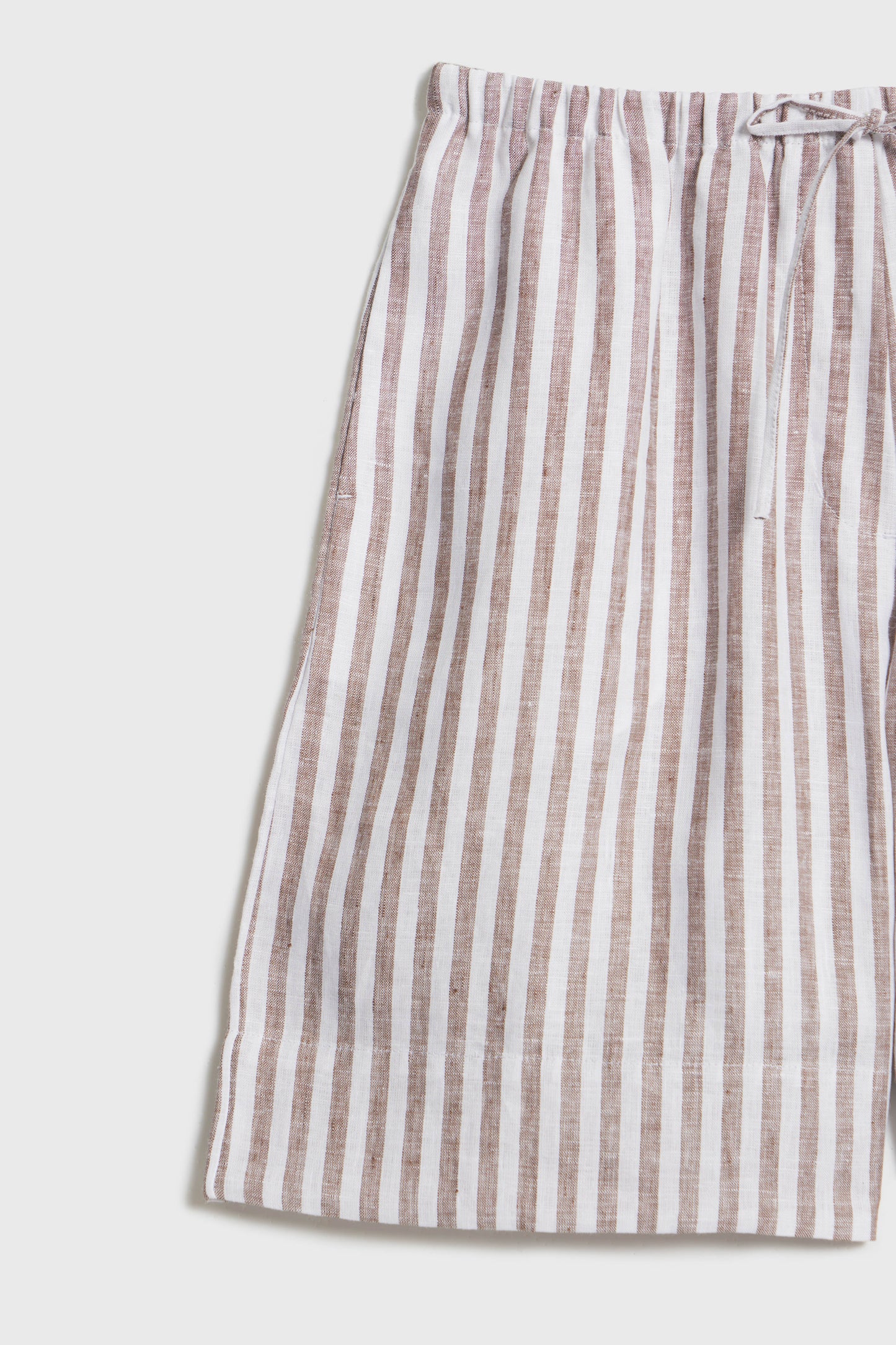Shorts in striped airy linen complemented by drawstring waist, and diagonal side pockets. Straight, wide legs.