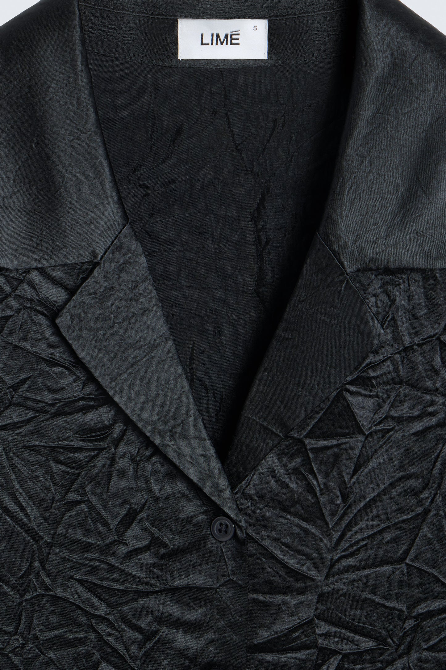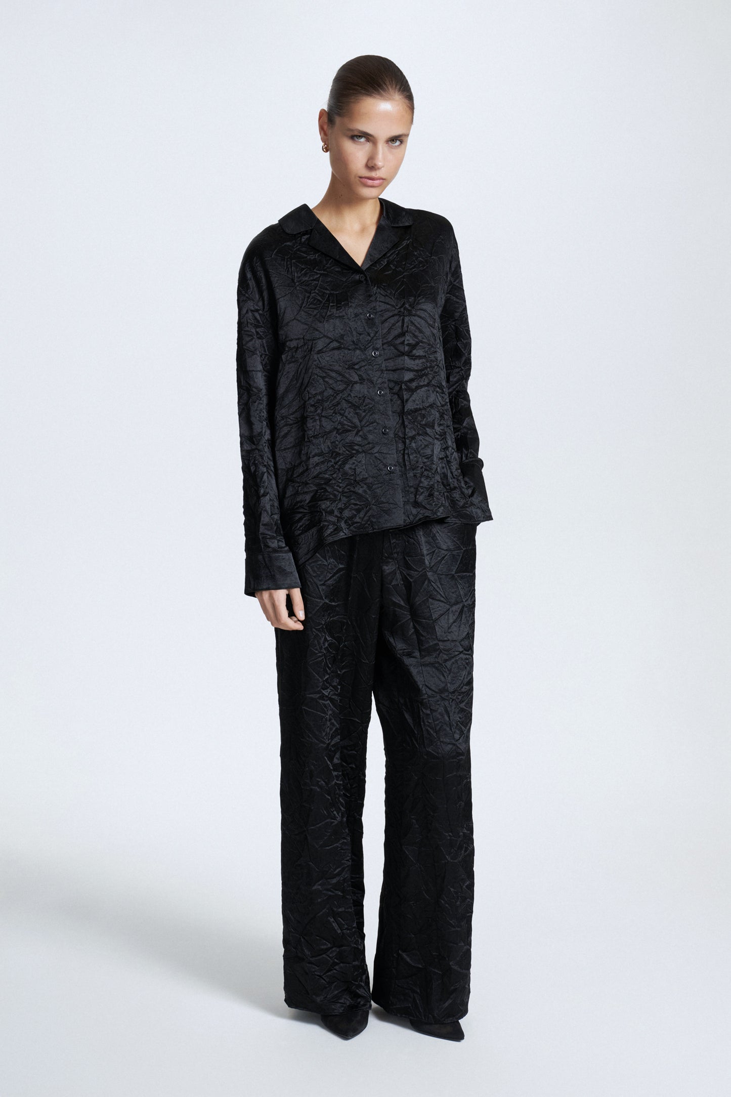 Faux silk shirt defined by a straight silhouette, a lapel collar and long cuffed sleeves. Wrinkled look fabric. Button-up front.