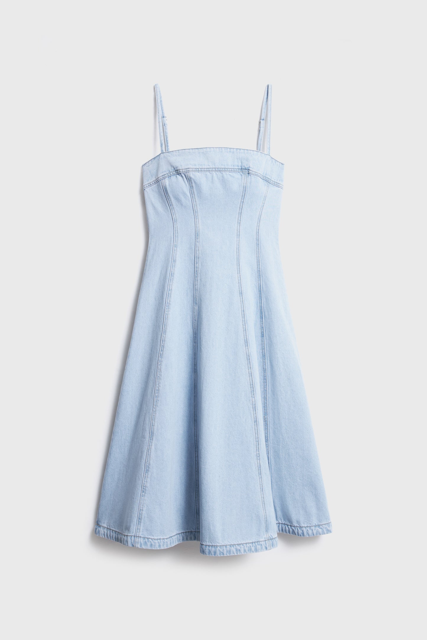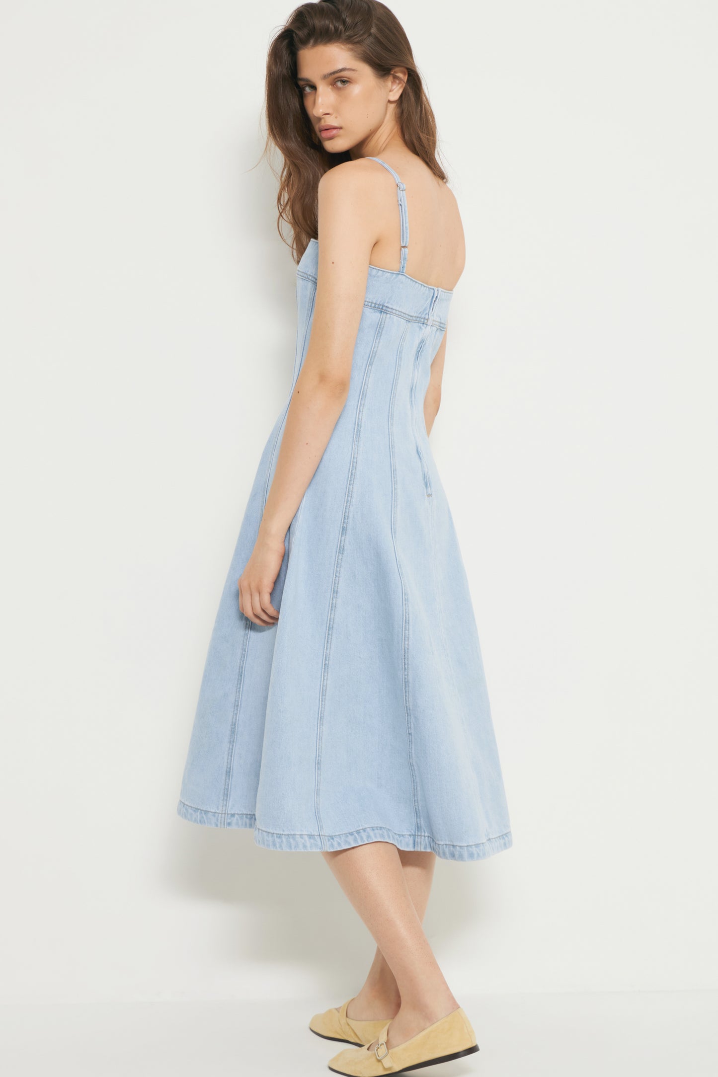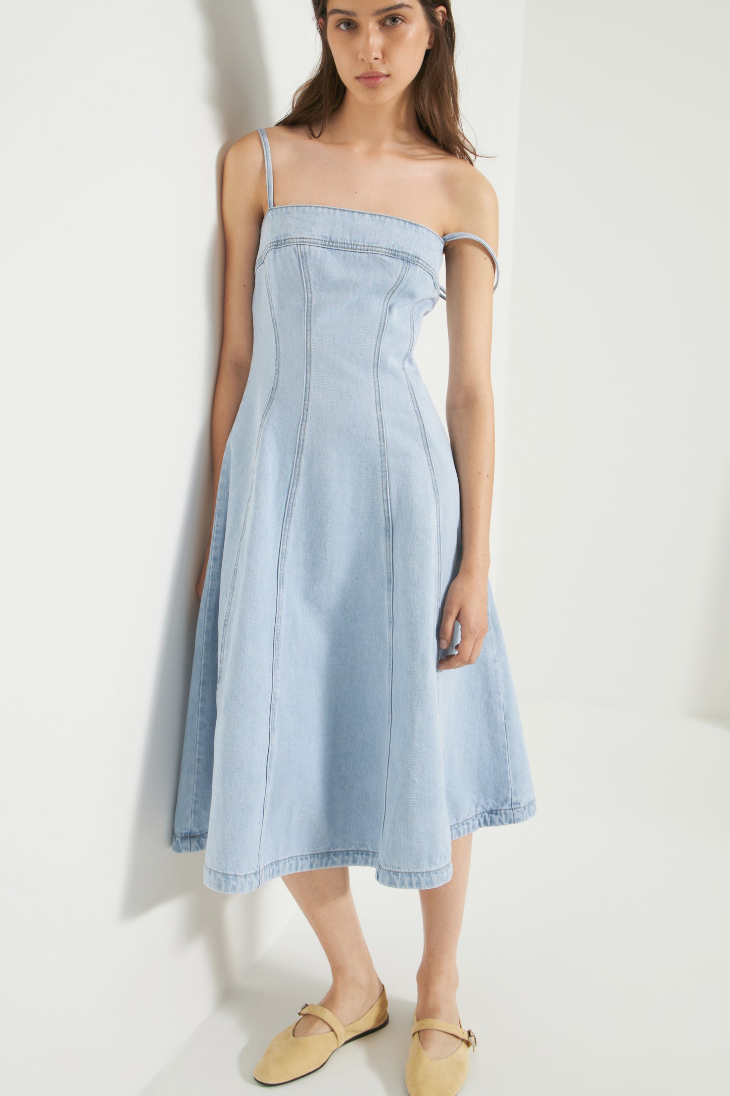 Calf-length dress in cotton denim with adjustable spaghetti shoulder straps and a fitted bodice with textured seams. A metal zip at the back.