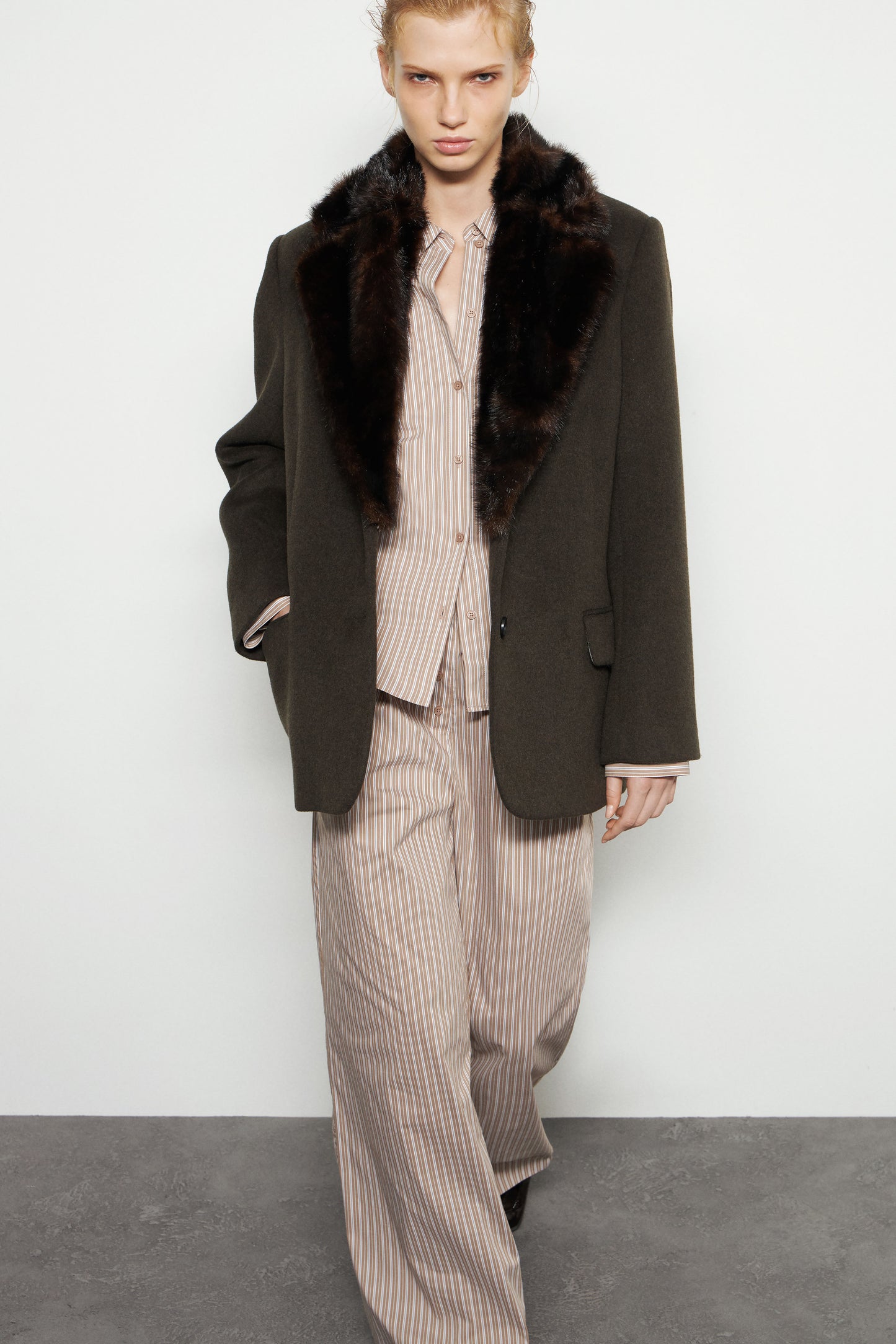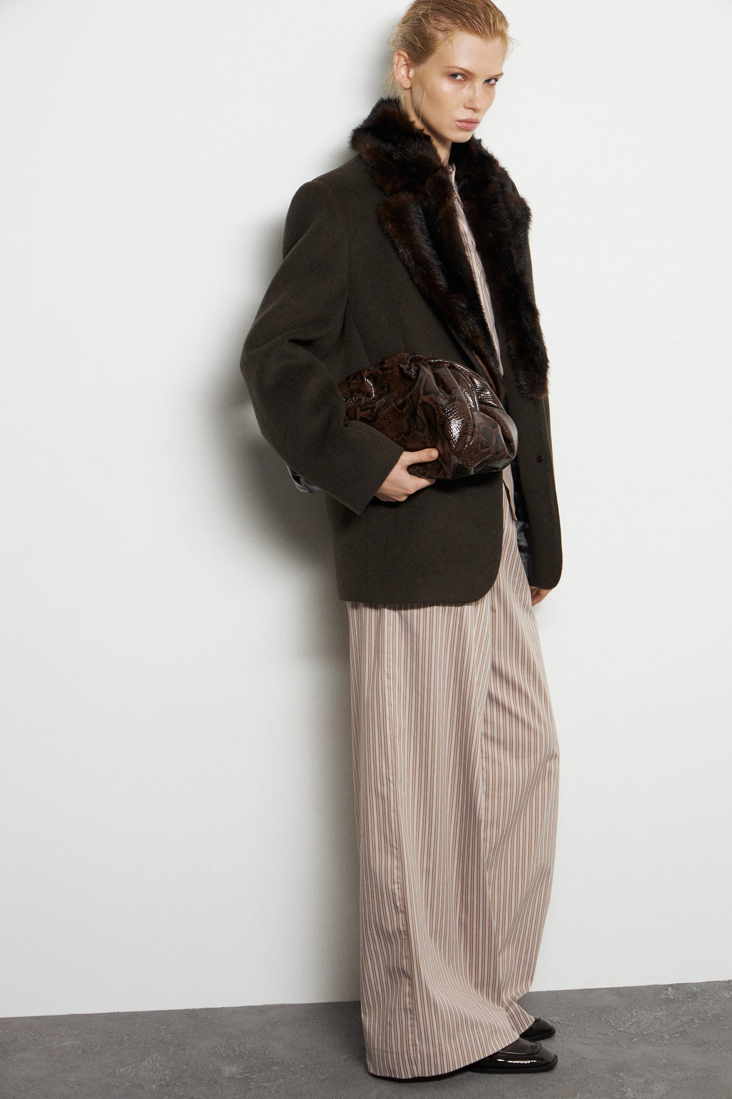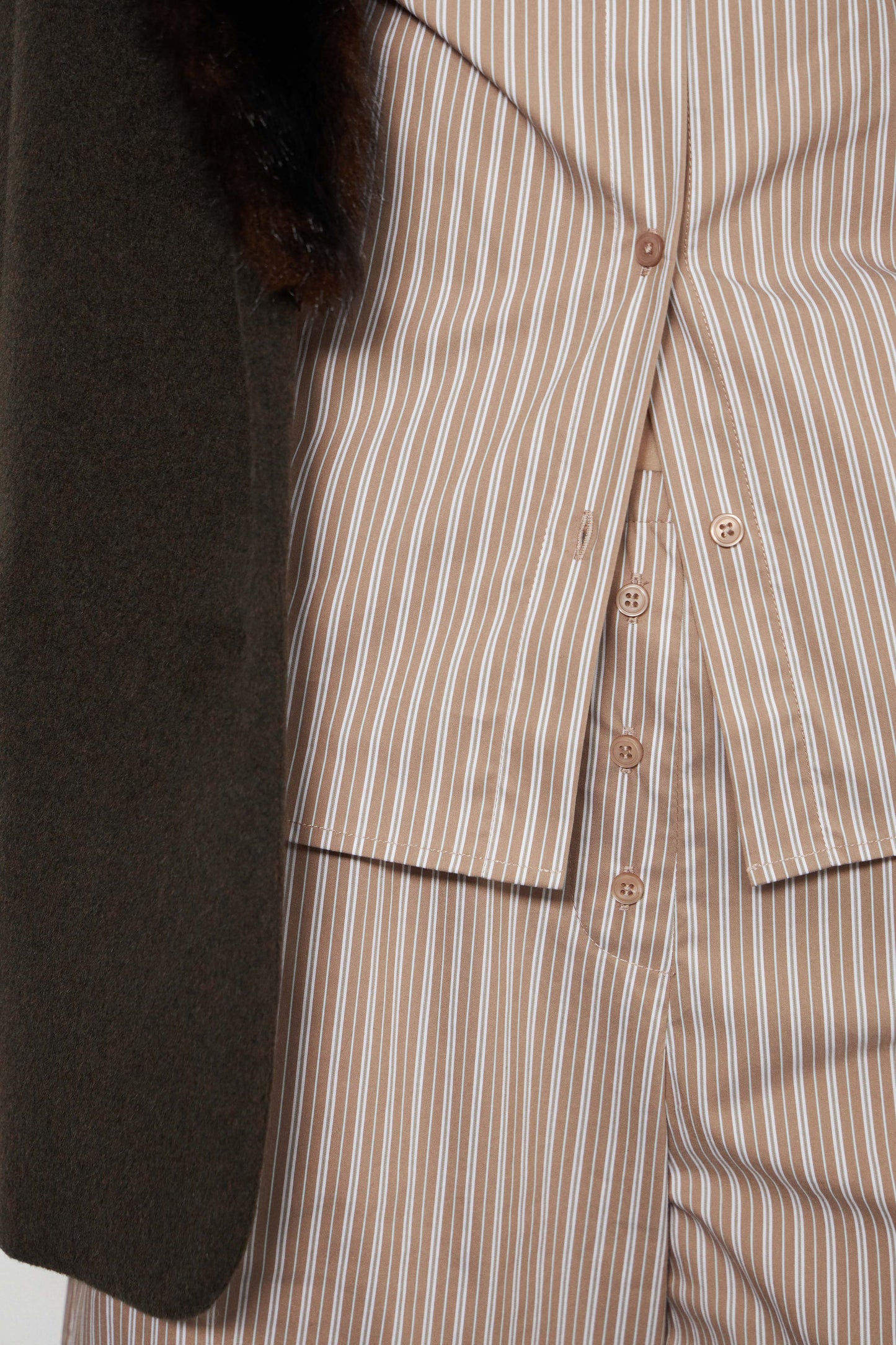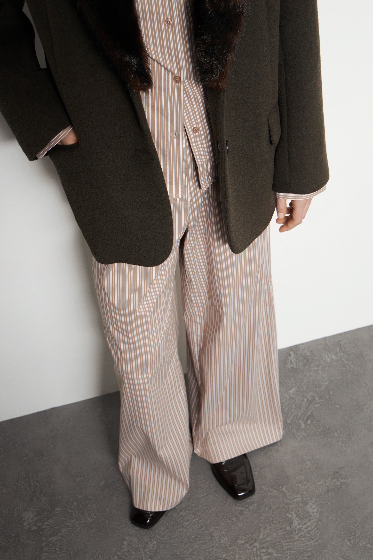 Loose-fit trousers in soft, woven fabric cotton blend. Covered elastic at waistband, mock fly with decorative buttons, and discreet side-seam pockets.