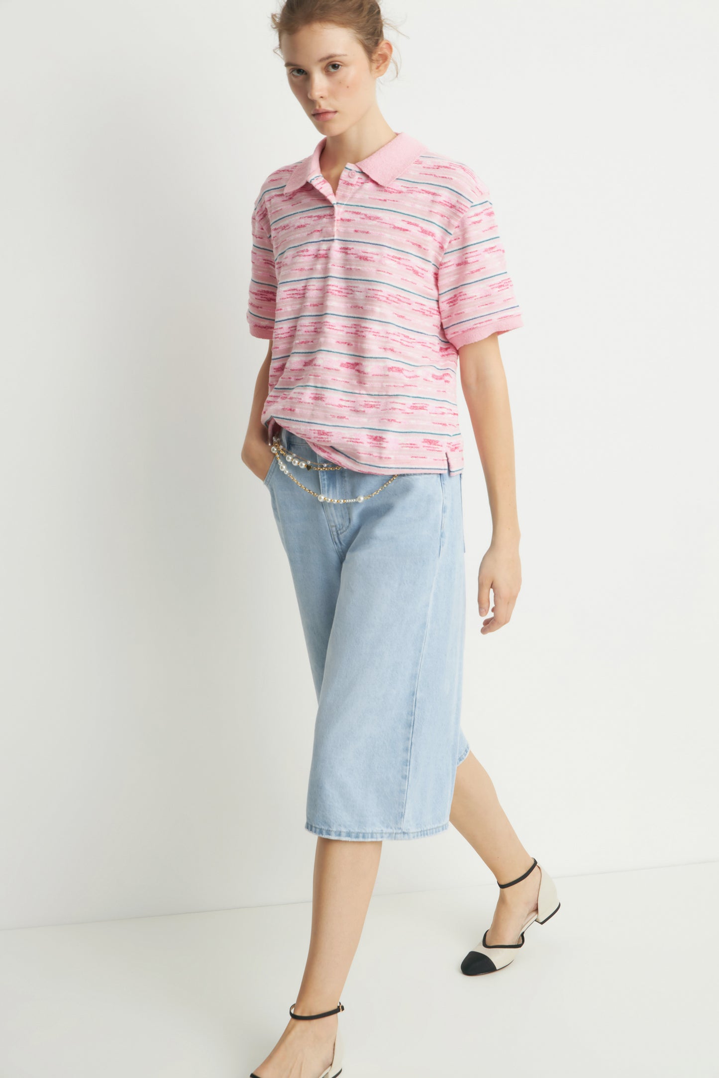 Regular-fit T-shirt in soft cotton blend jersey. Multi-colored striped pattern. Classic polo collar, button placket and a straight-cut hem.