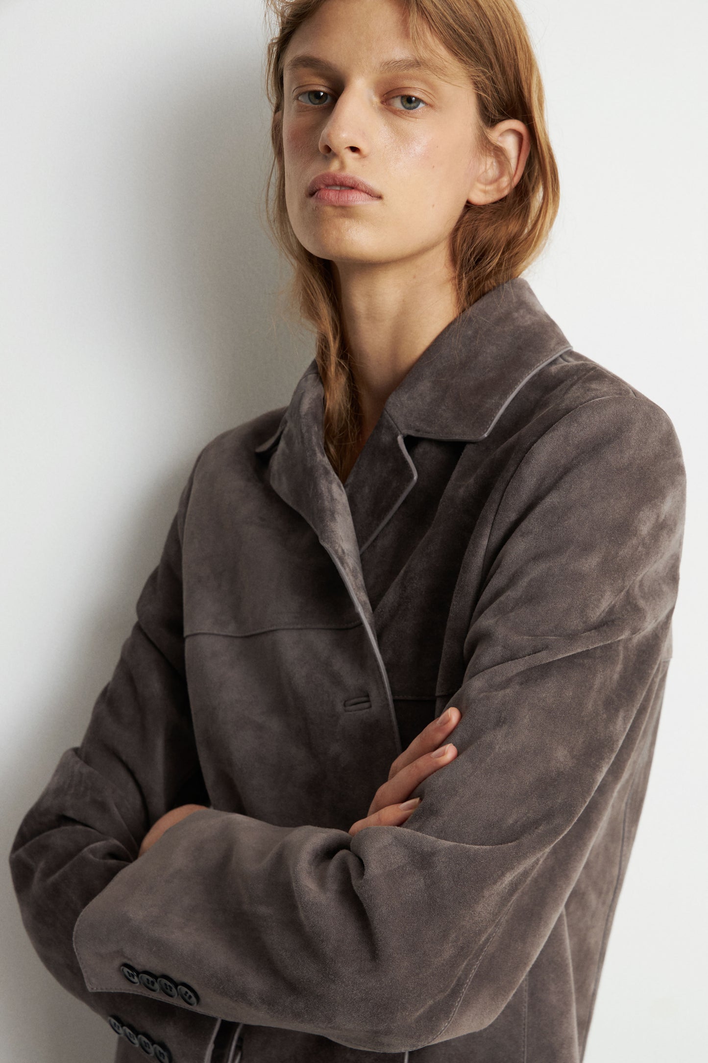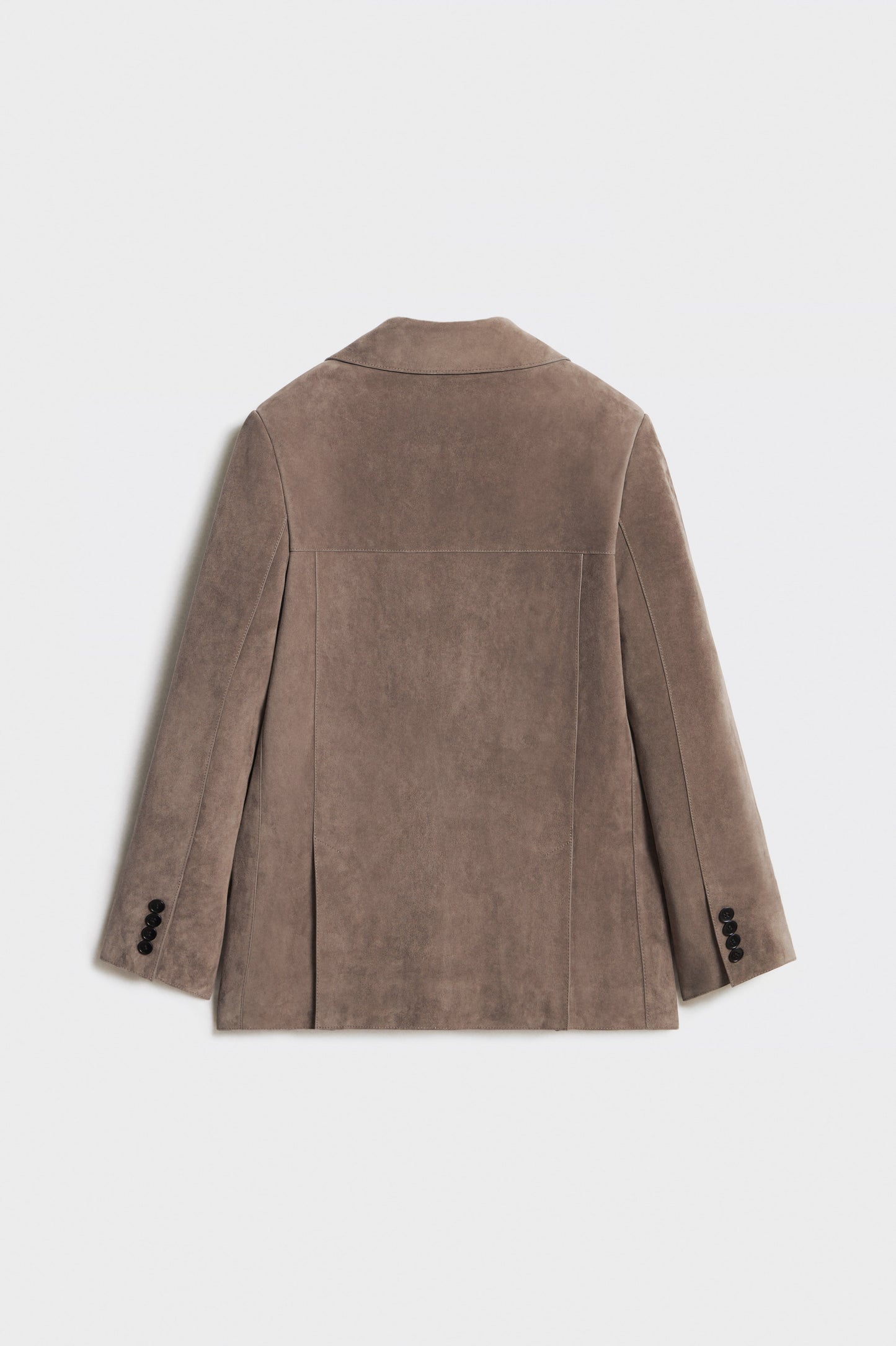 Oversized blazer is crafted from softly brushed suede. Featuring notched lapel collar and long sleeves with buttoned cuffs, shoulder pads. Front hip flap pockets. Matching lining. Single-breasted front with buttons.