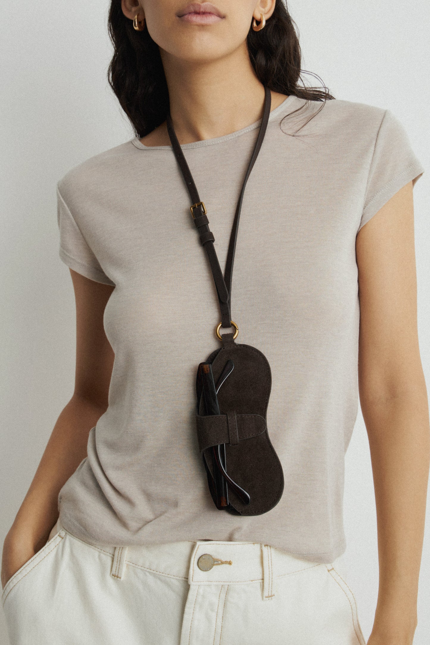 Case for sunglasses in soft suede featuring a long strap. Size: 16 x 0.3 x 7 cm (length x width x height).
