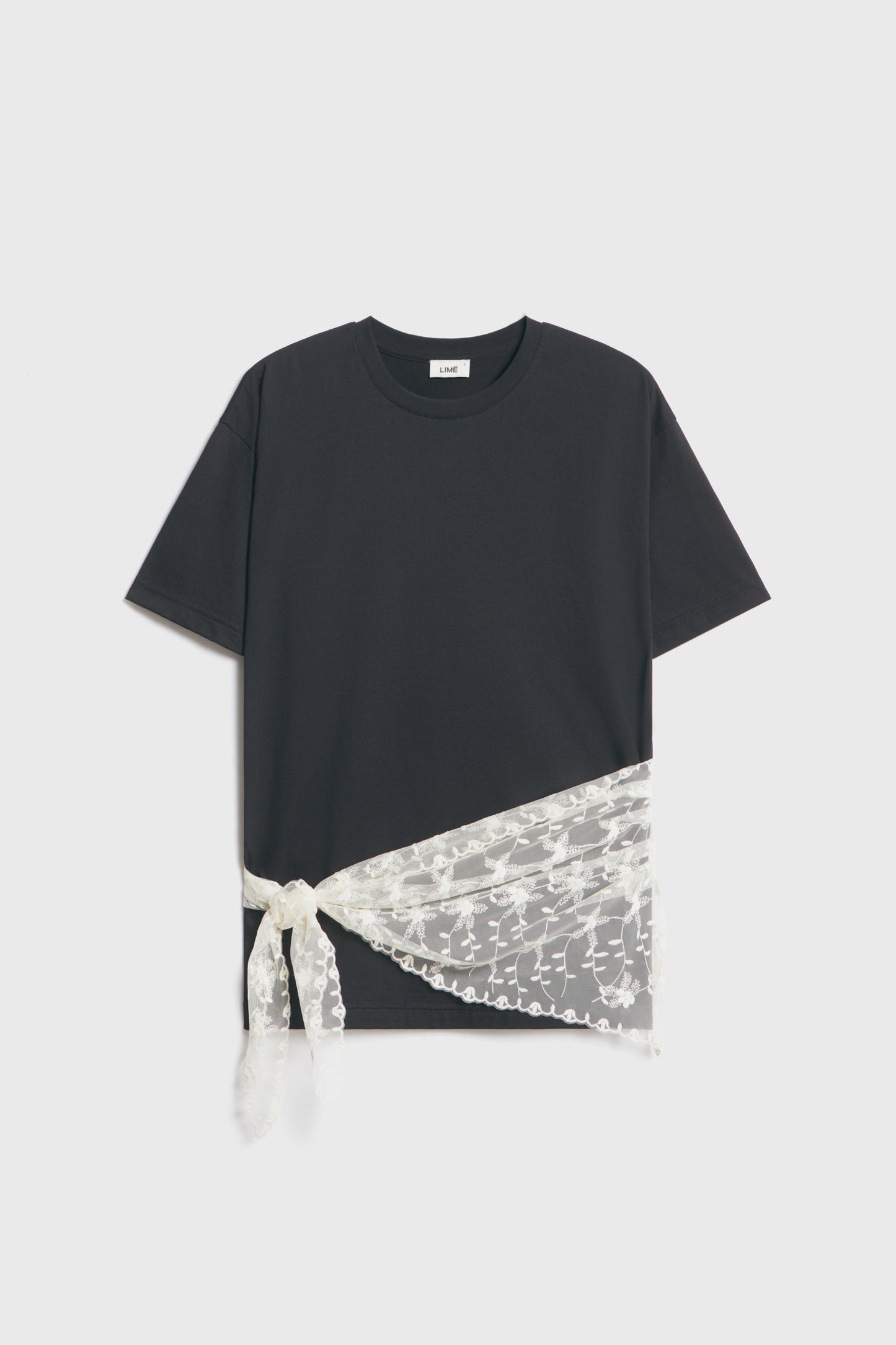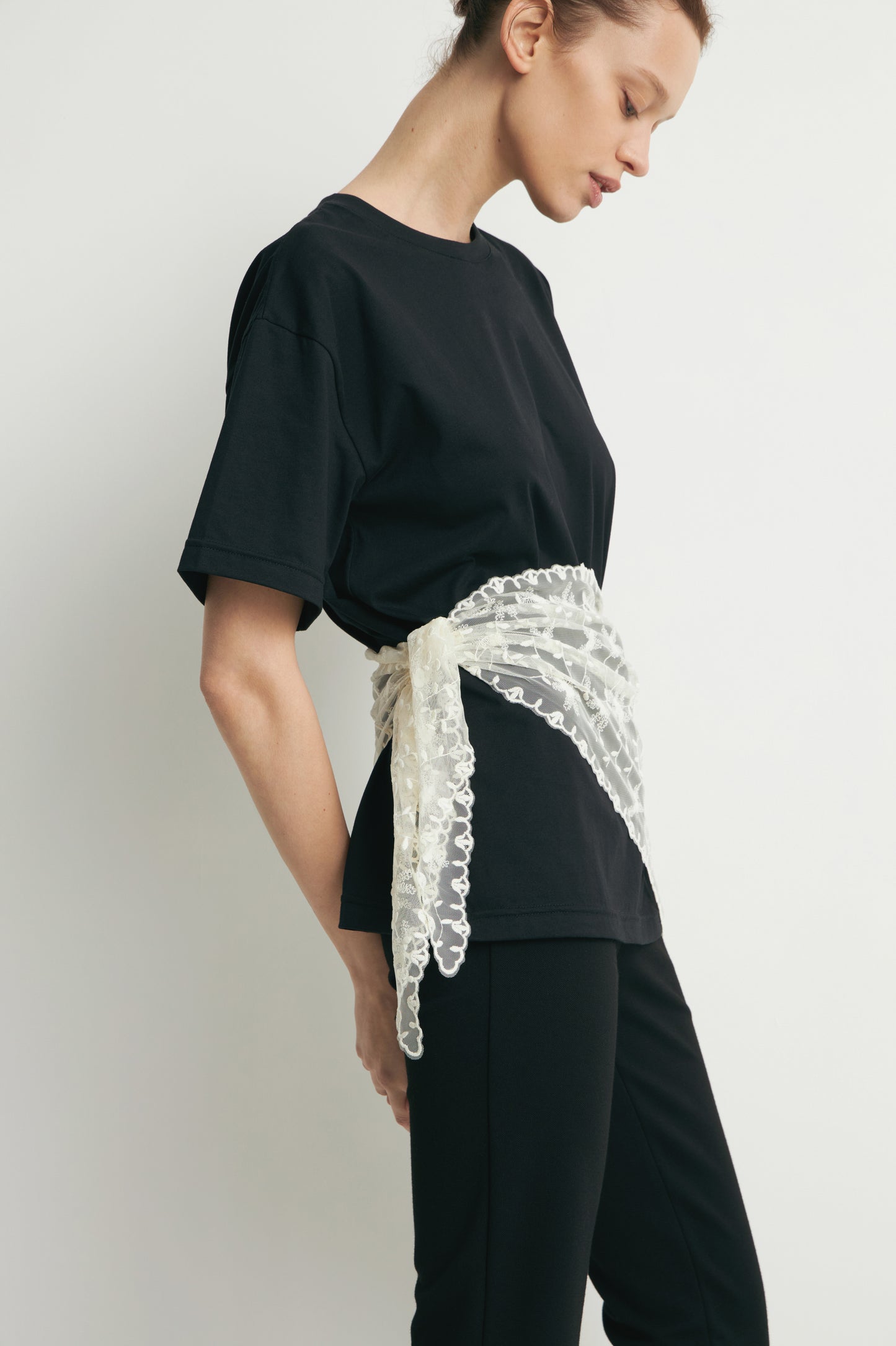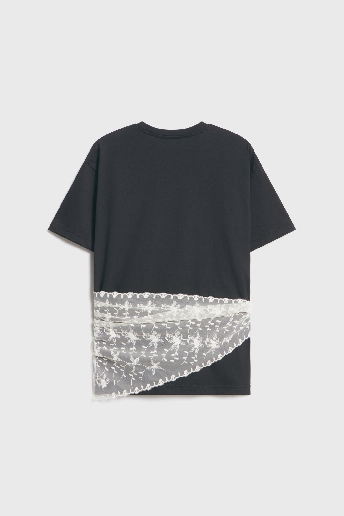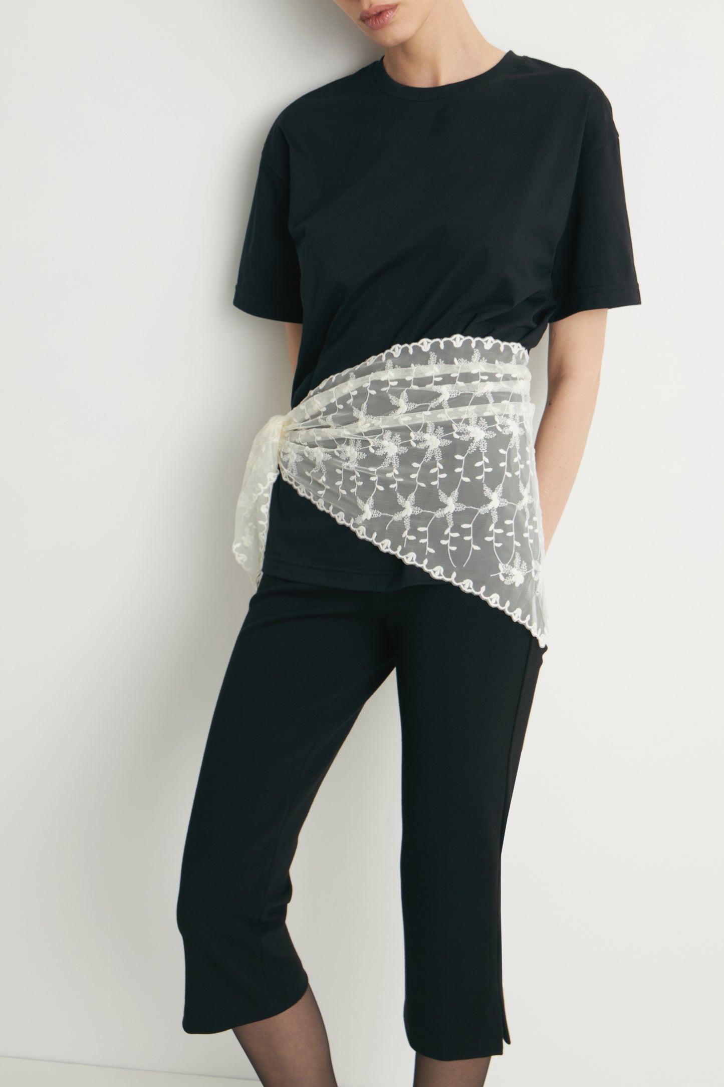 Fitted T-shirt in a cotton jersey with sophisticated lace detail that highlight its uniqueness. Round neckline and short sleeves.