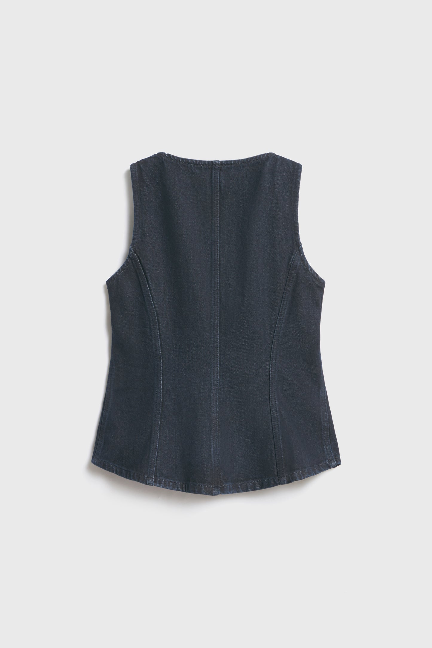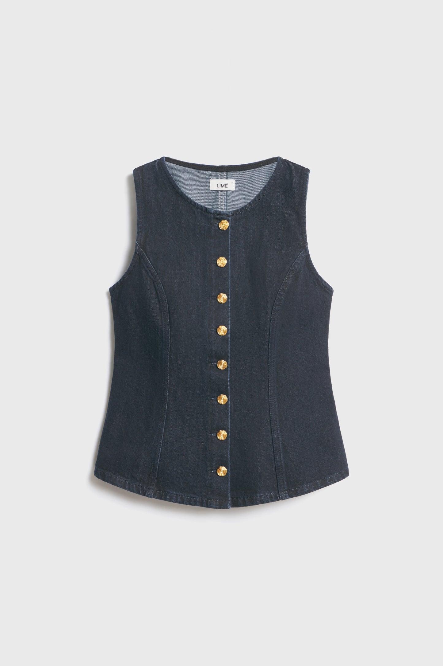 Fitted vest in cotton denim with princess seams at front and back. Round neckline, metal front buttons, and a flared cut from waist to hem.