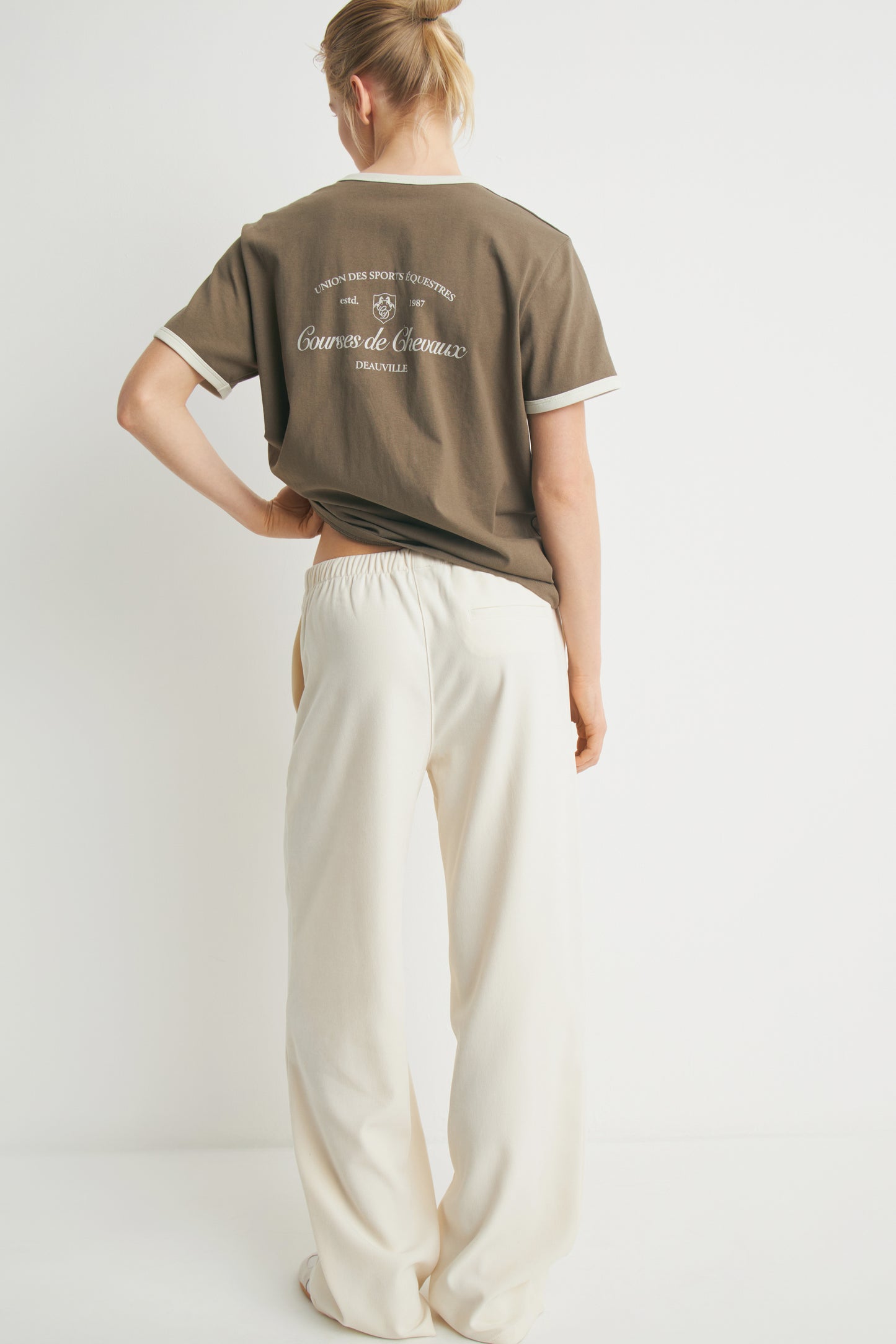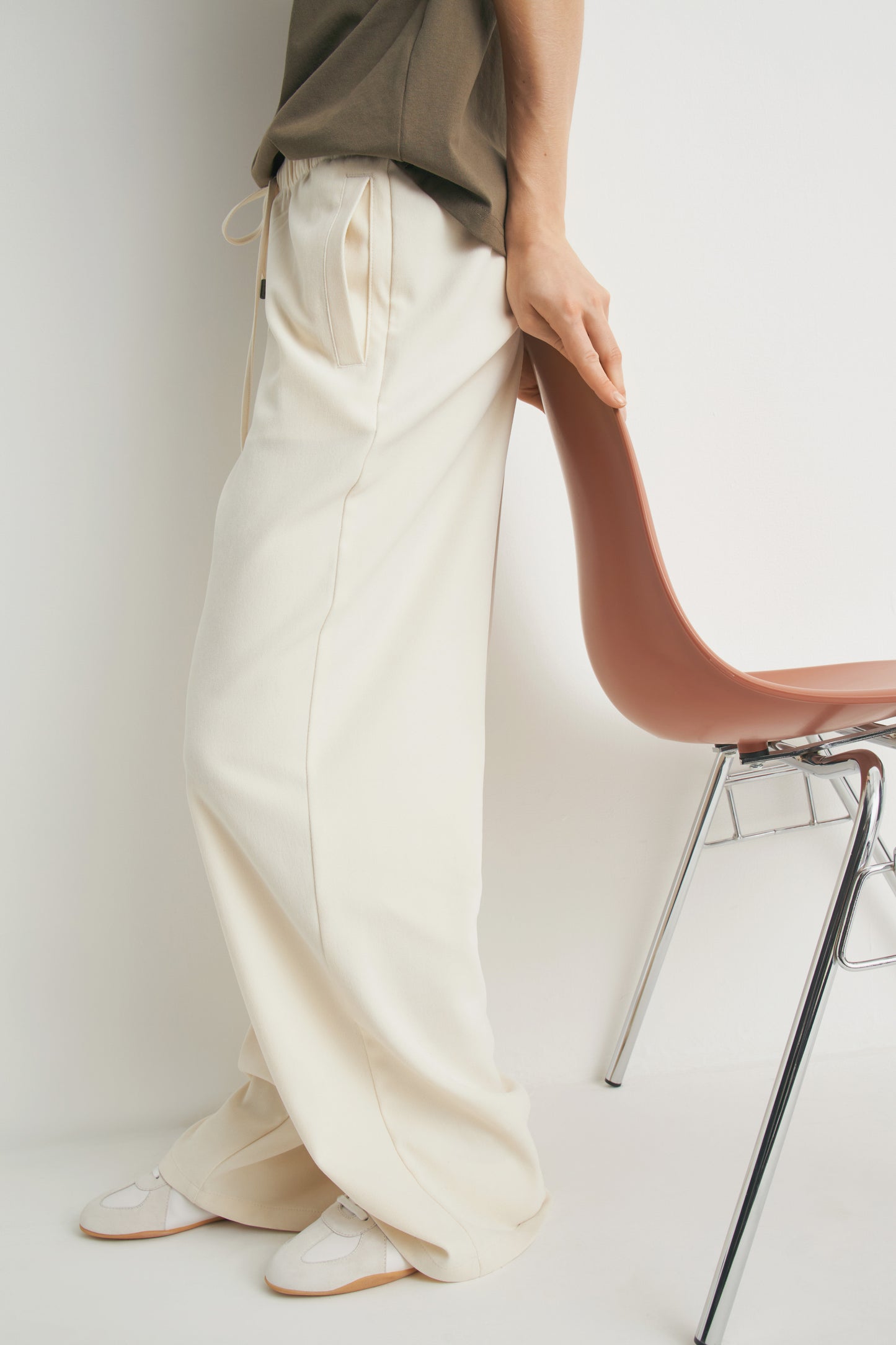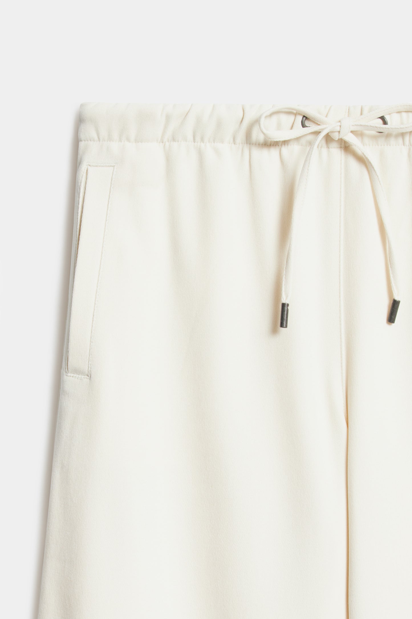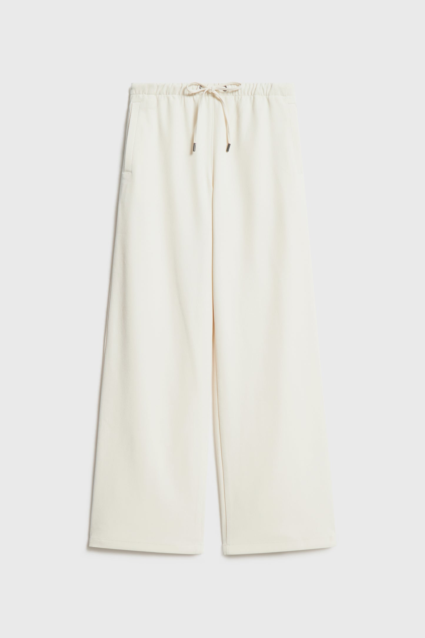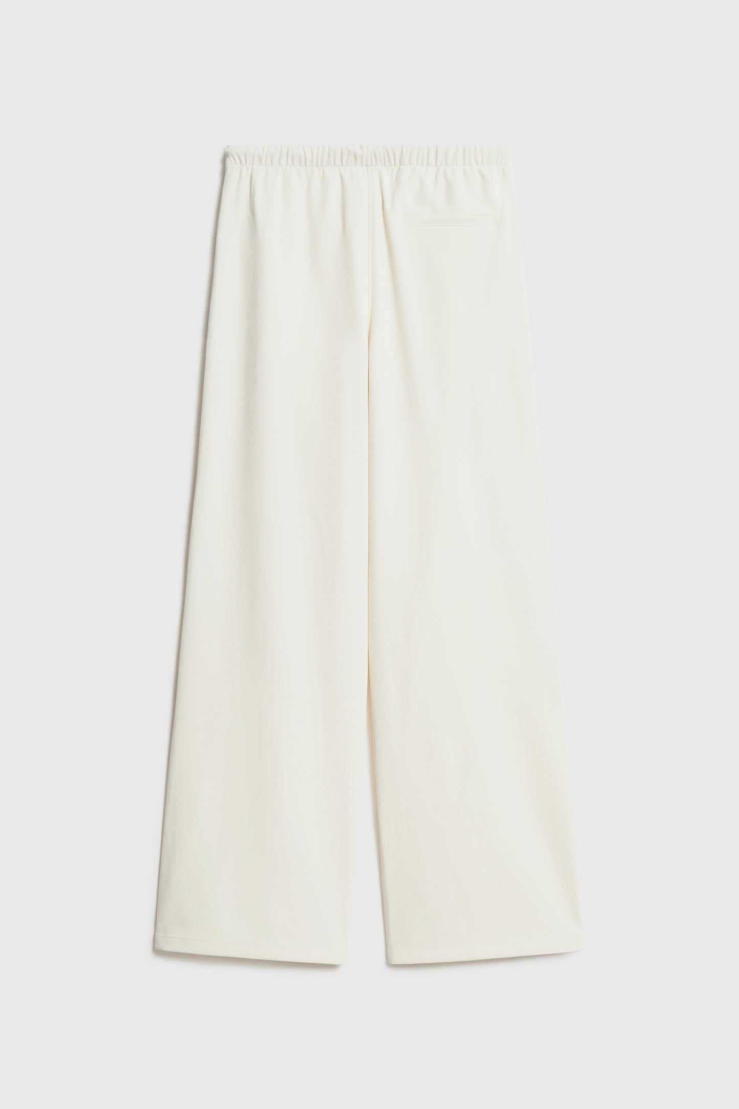 Full-length velour trousers. Mid-rise design with wide legs. Featuring an elasticated waistband with adjustable drawstring. Side pockets and fake rear welt pocket.