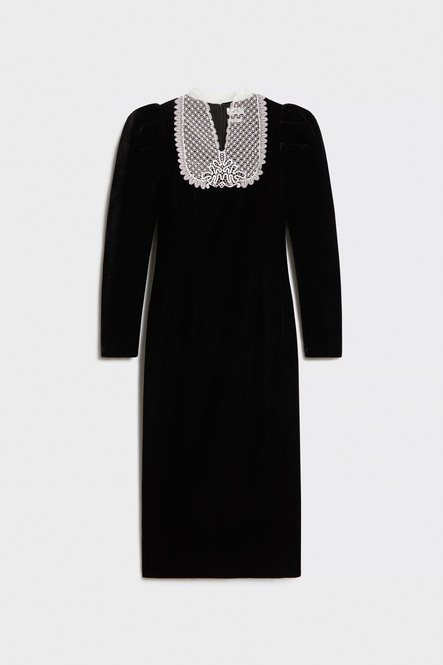 Calf-length, tailored velvet dress. Featuring a lace contrast bib front and long puff sleeves. Slightly tailored hem, and back small button and zip fastening. Lined.
