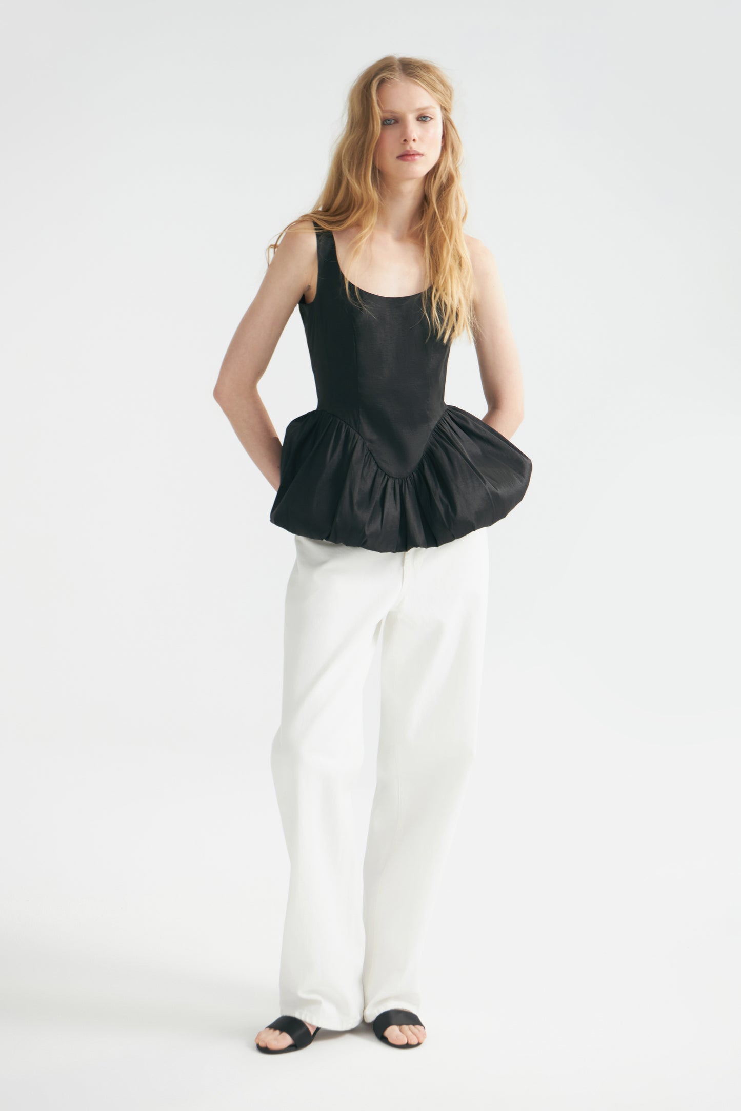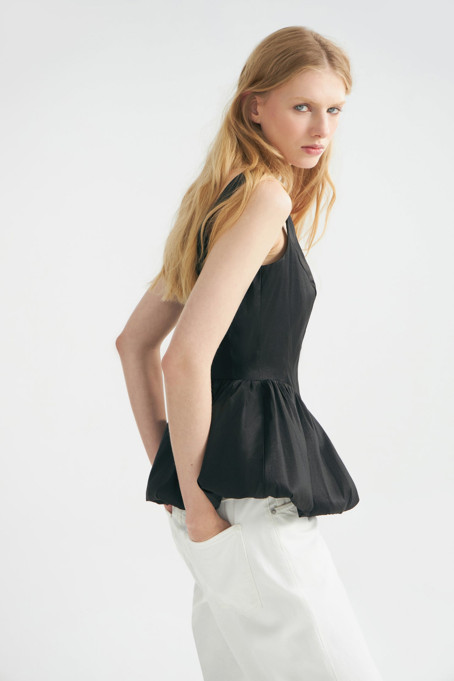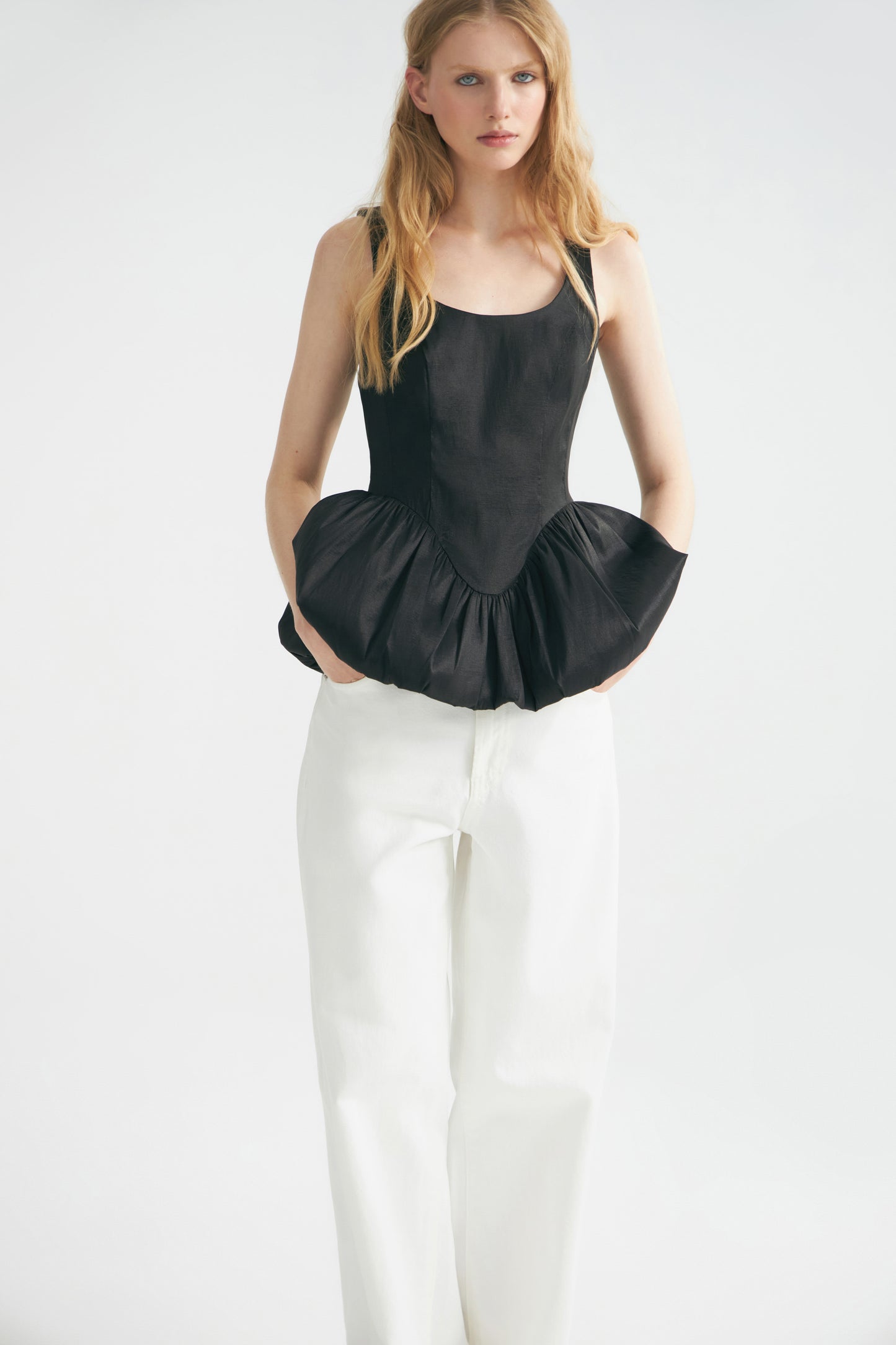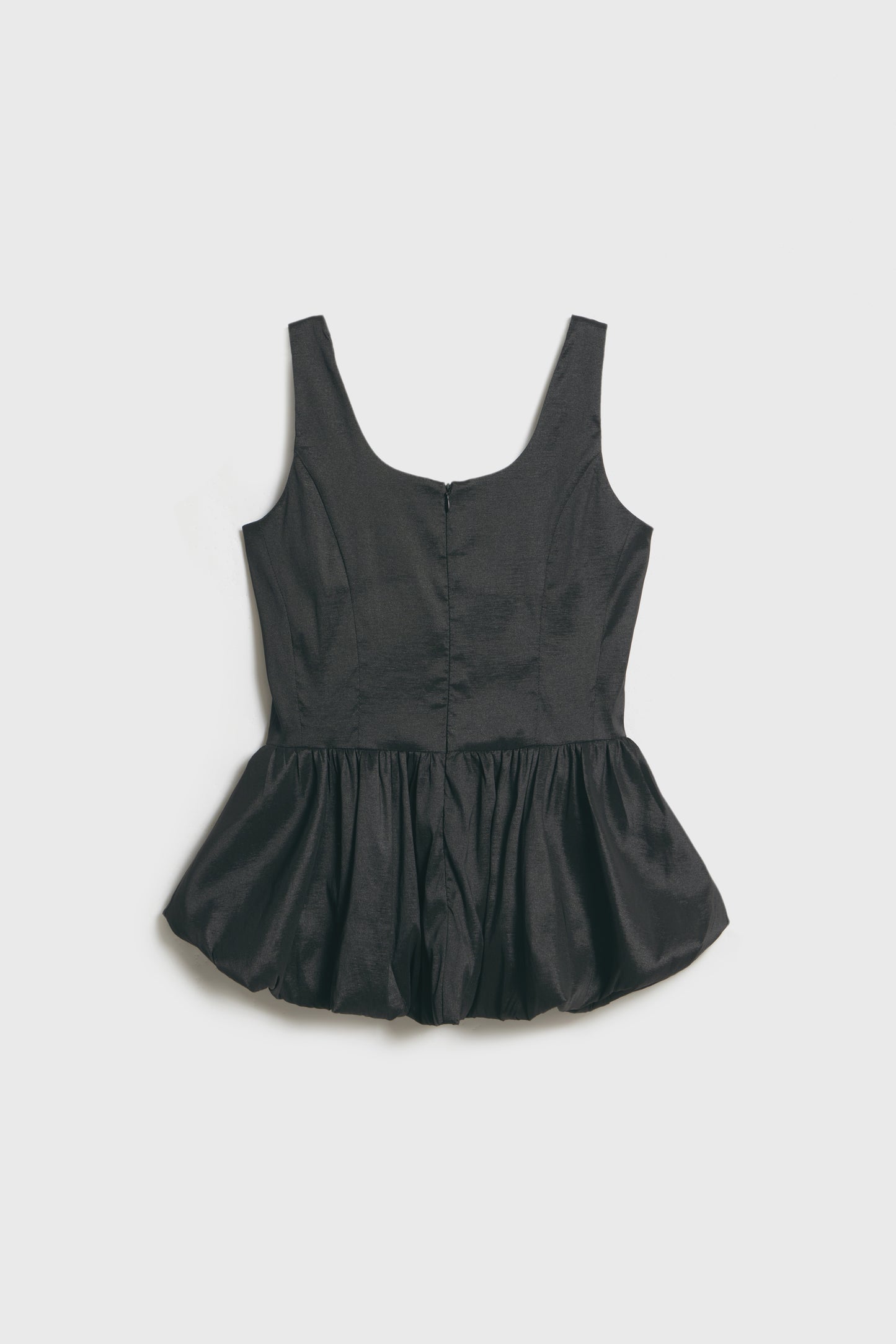 Taffeta top featuring wide straps and back zip fastening. Curved seam at the waist and a flared bubble-hem peplum with mesh lining.