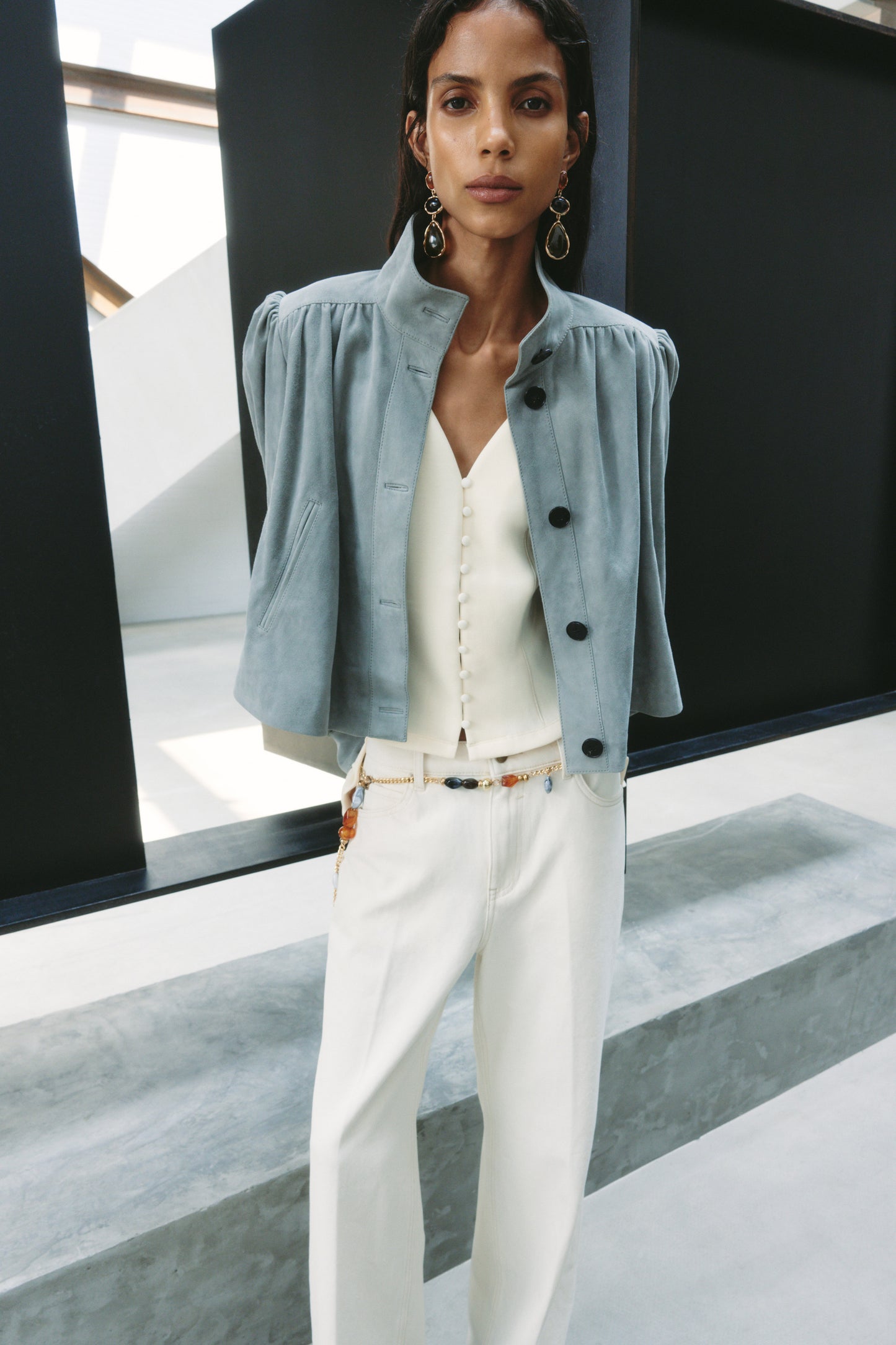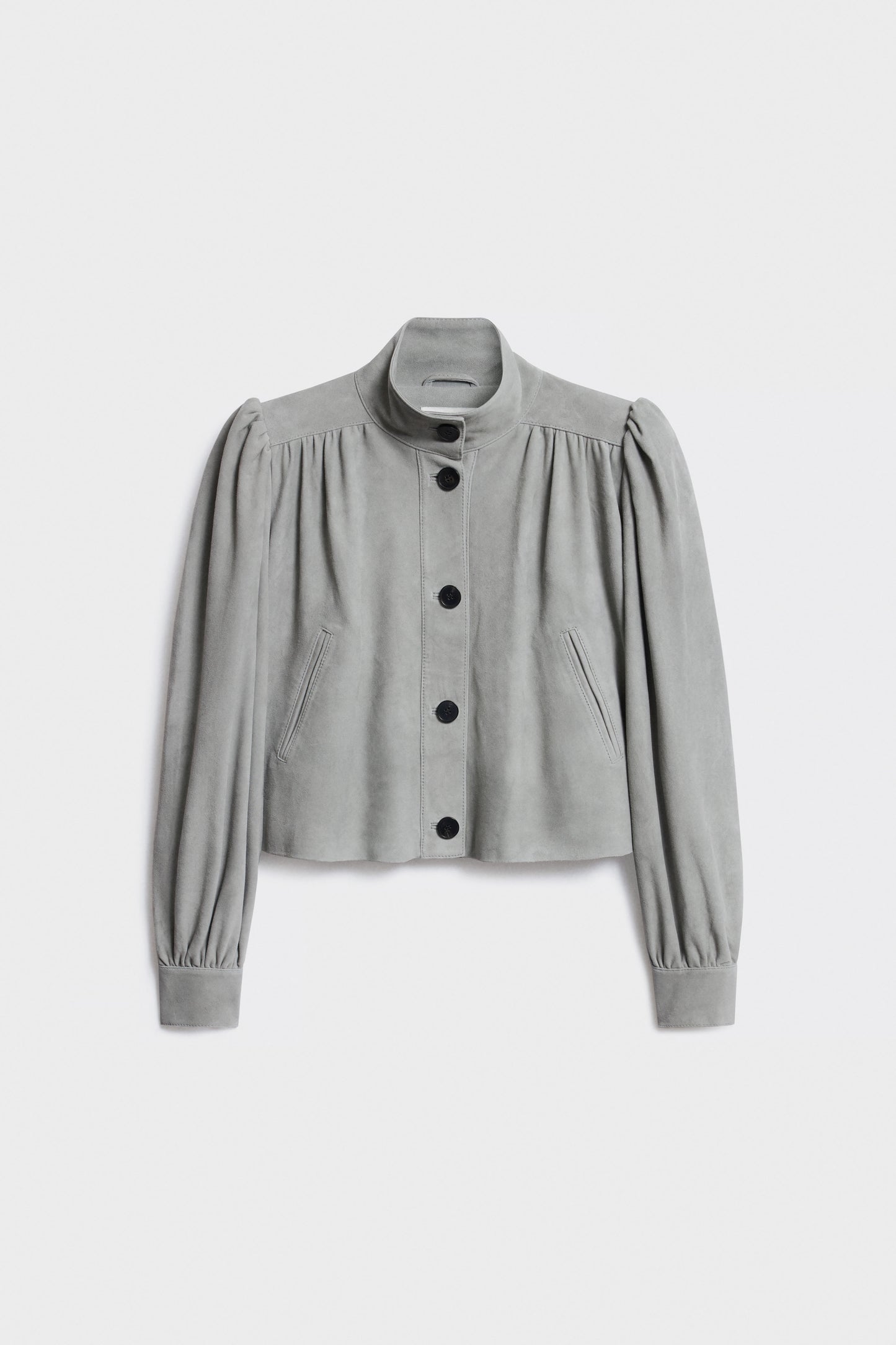 Draped blazer in a soft sheep suede. Stand-up collar, shoulder pads, long sleeves and front double-breasted button closure. Interior lining.
