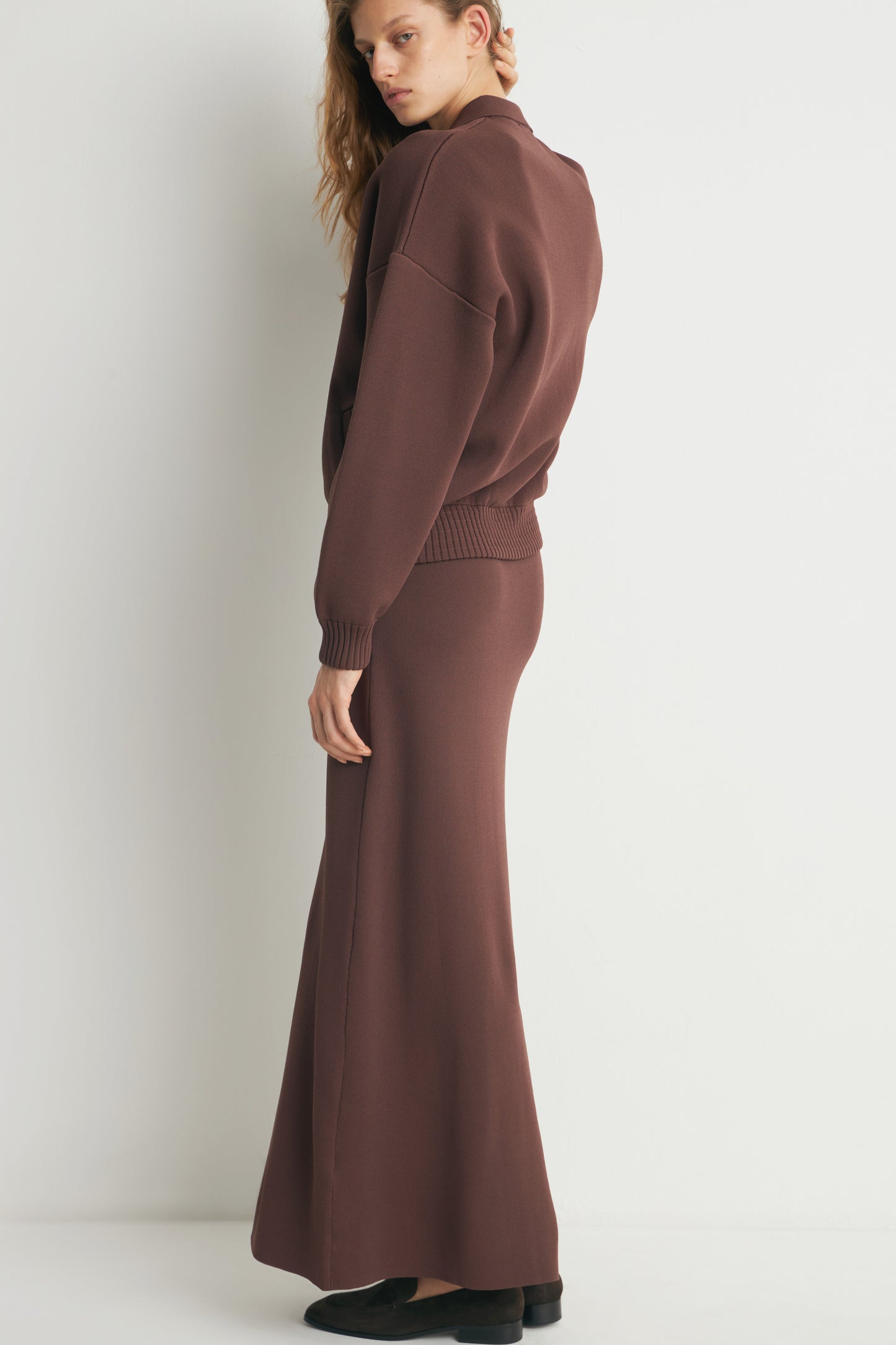 Long skirt in a soft viscose blend knit with an elasticated waist. Flared hem.
