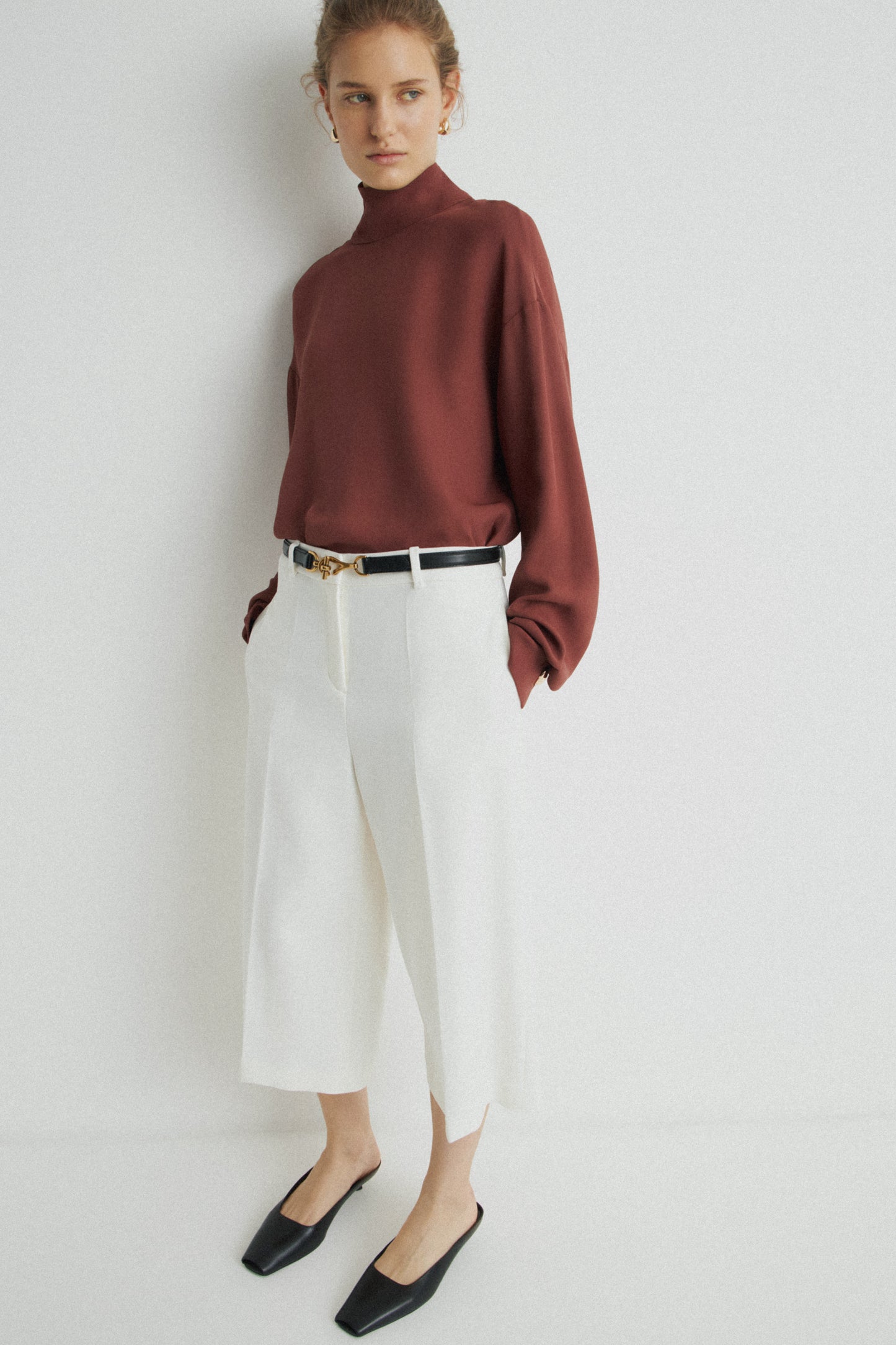 Loose-fit blouse in viscose and lyocell blend is enriched by decorative metal buttons. High neck and long sleeves with cuffs.