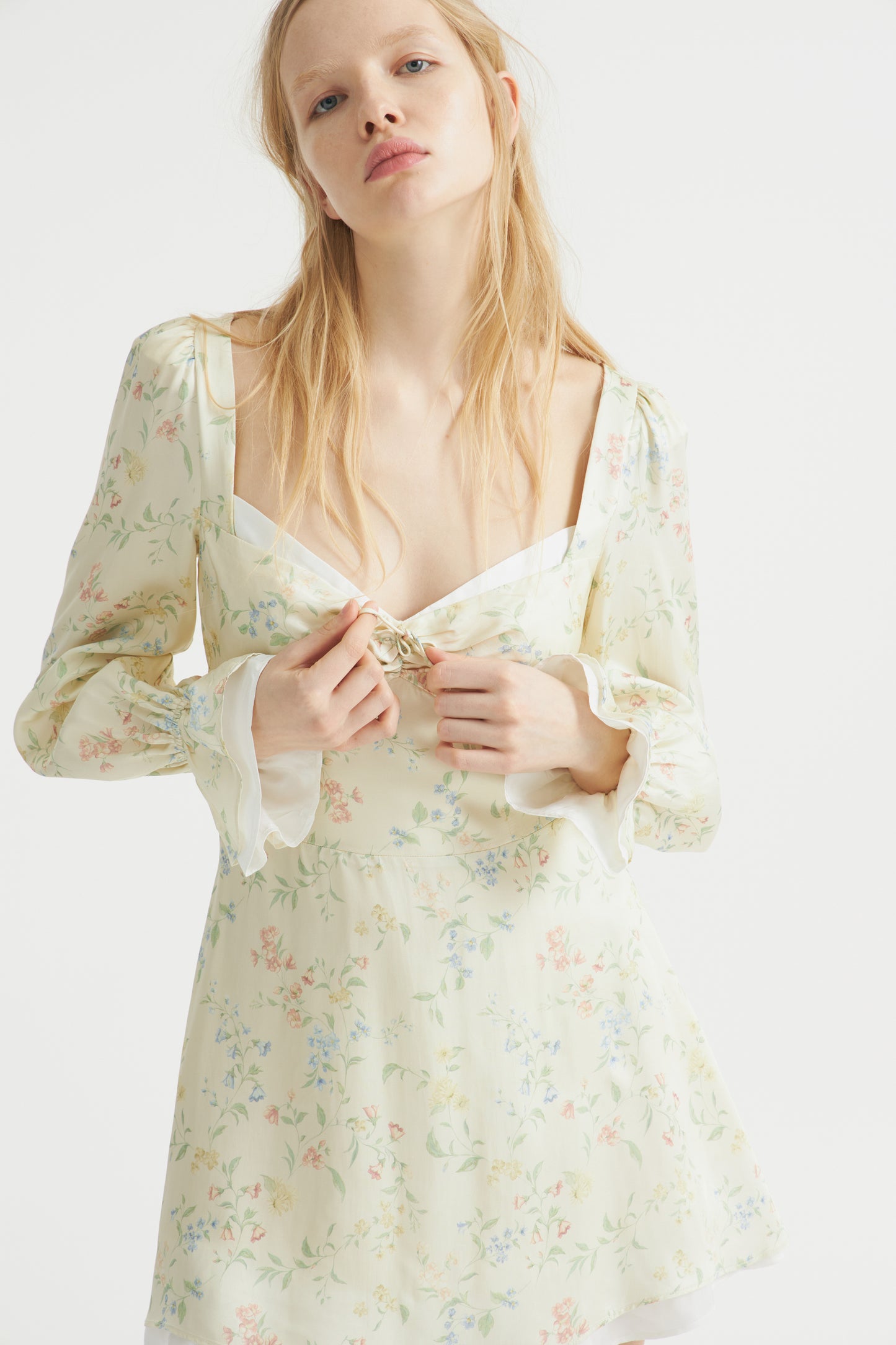 This mini dress crafted from high-shine printed satin and designed with a corset-like neckline with drawstring, a fitted body, seam details and bust darts. Lined. A concealed zip at the back.