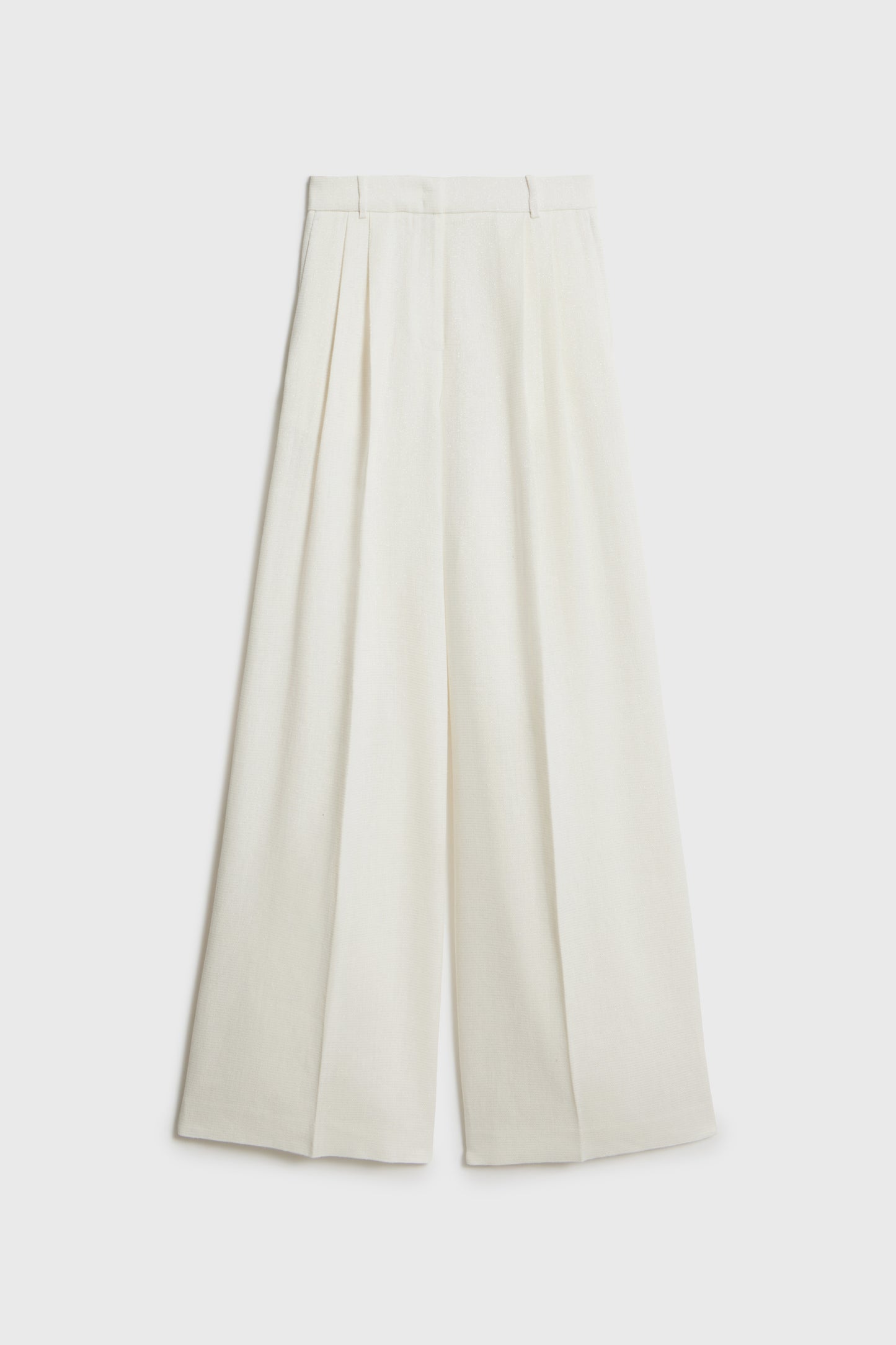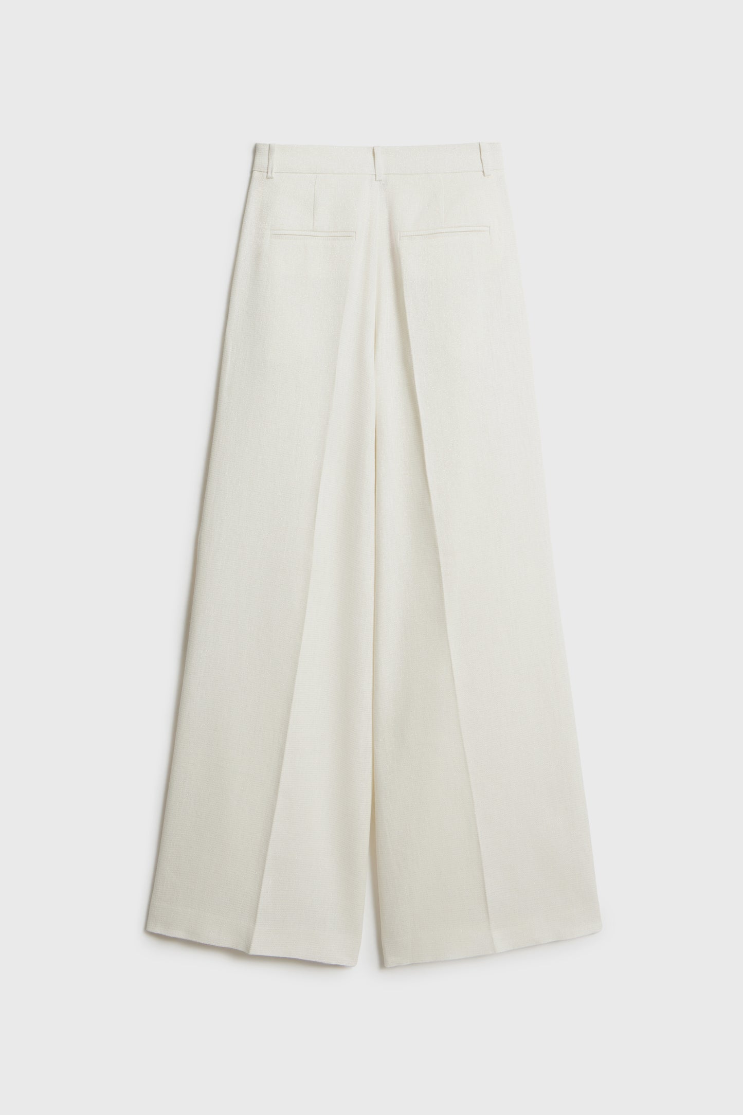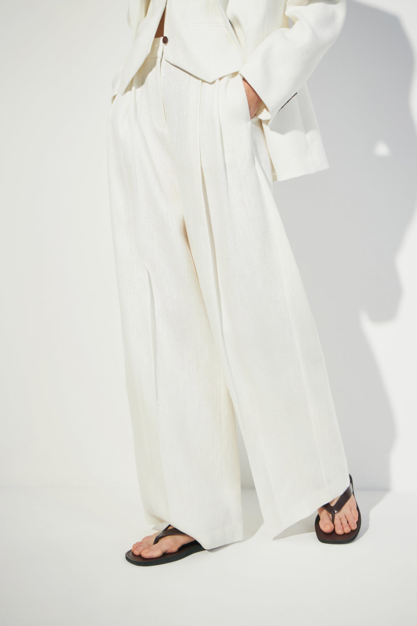 Trousers with darts in linen and cotton woven fabric with metallic threads. Wide-leg design. Featuring front pockets and fake rear welt pockets. Front zip fly, inner button and metal hook fastening.