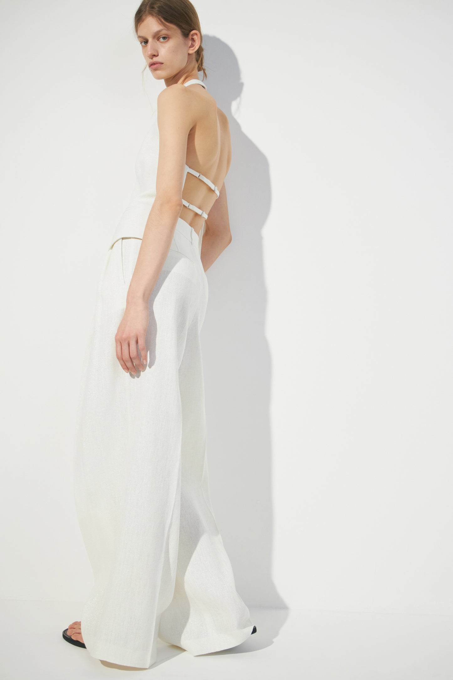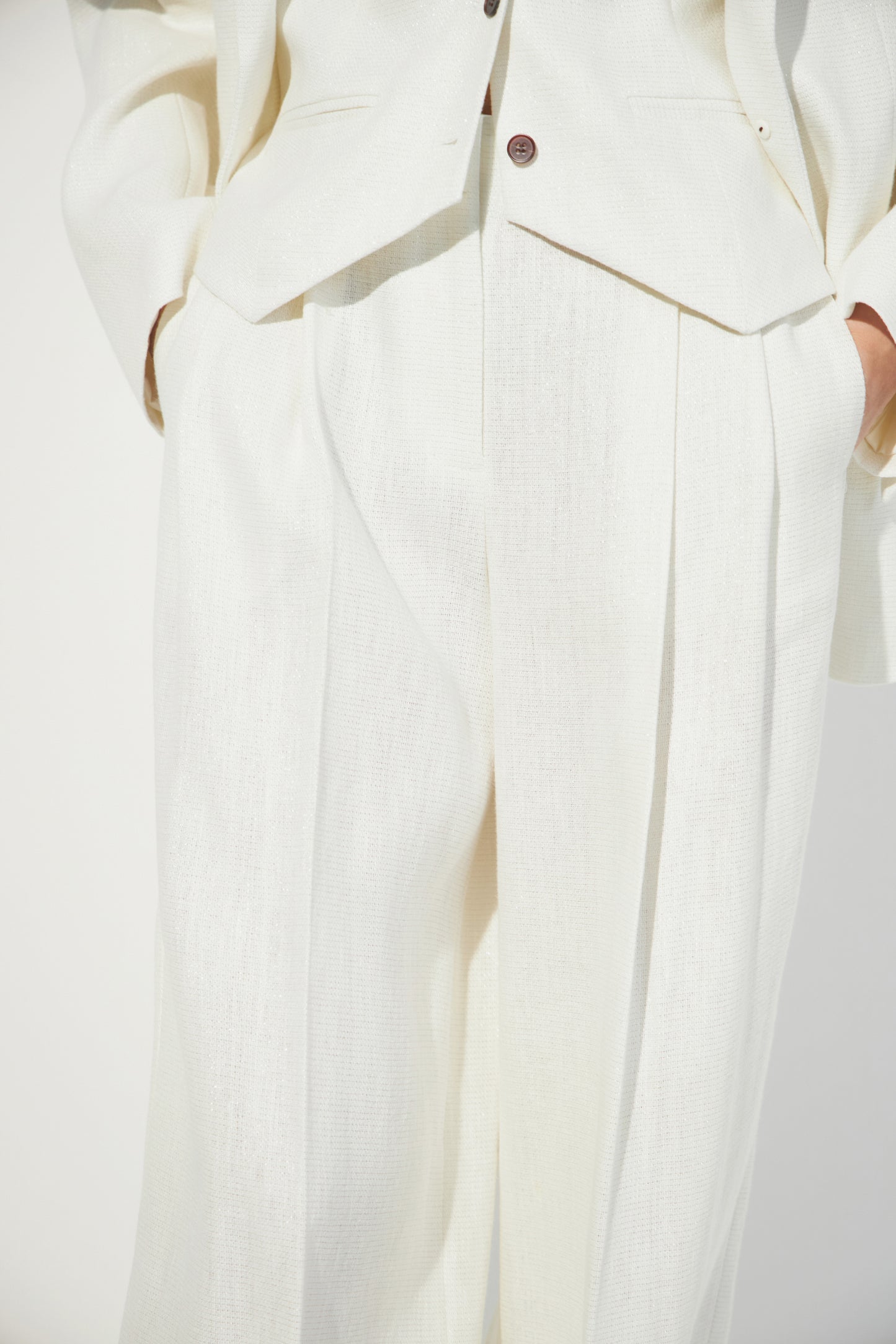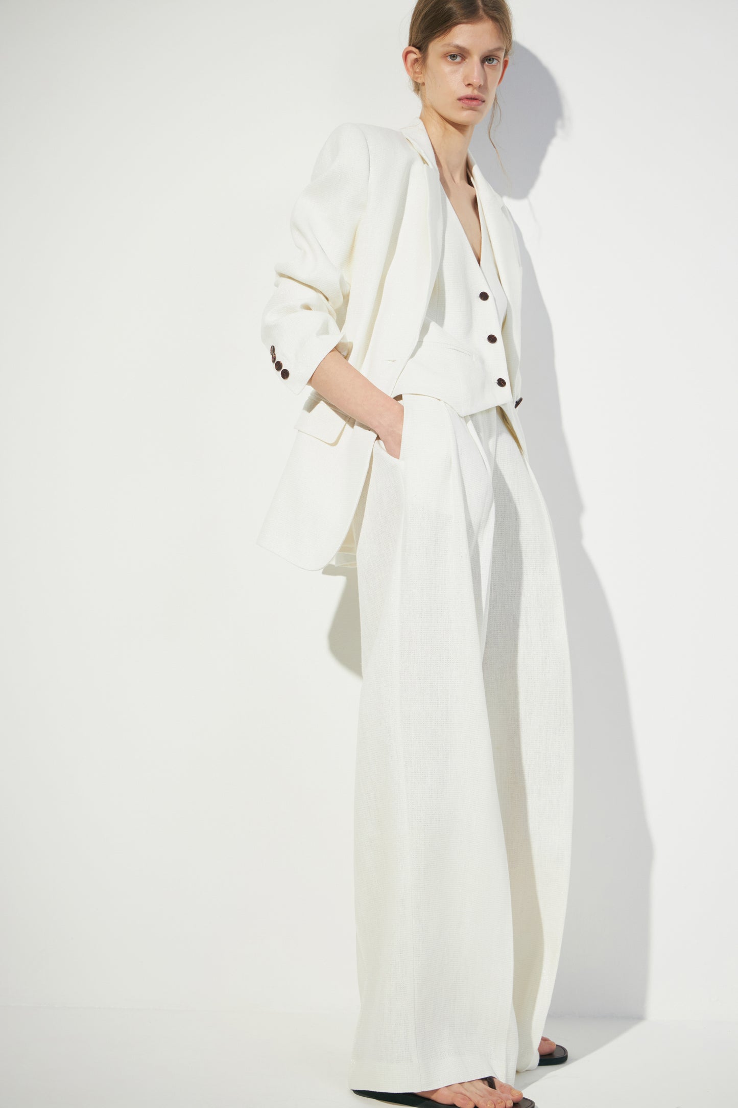 Trousers with darts in linen and cotton woven fabric with metallic threads. Wide-leg design. Featuring front pockets and fake rear welt pockets. Front zip fly, inner button and metal hook fastening.
