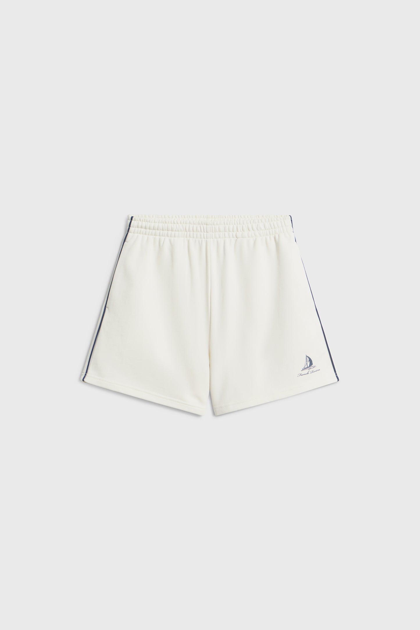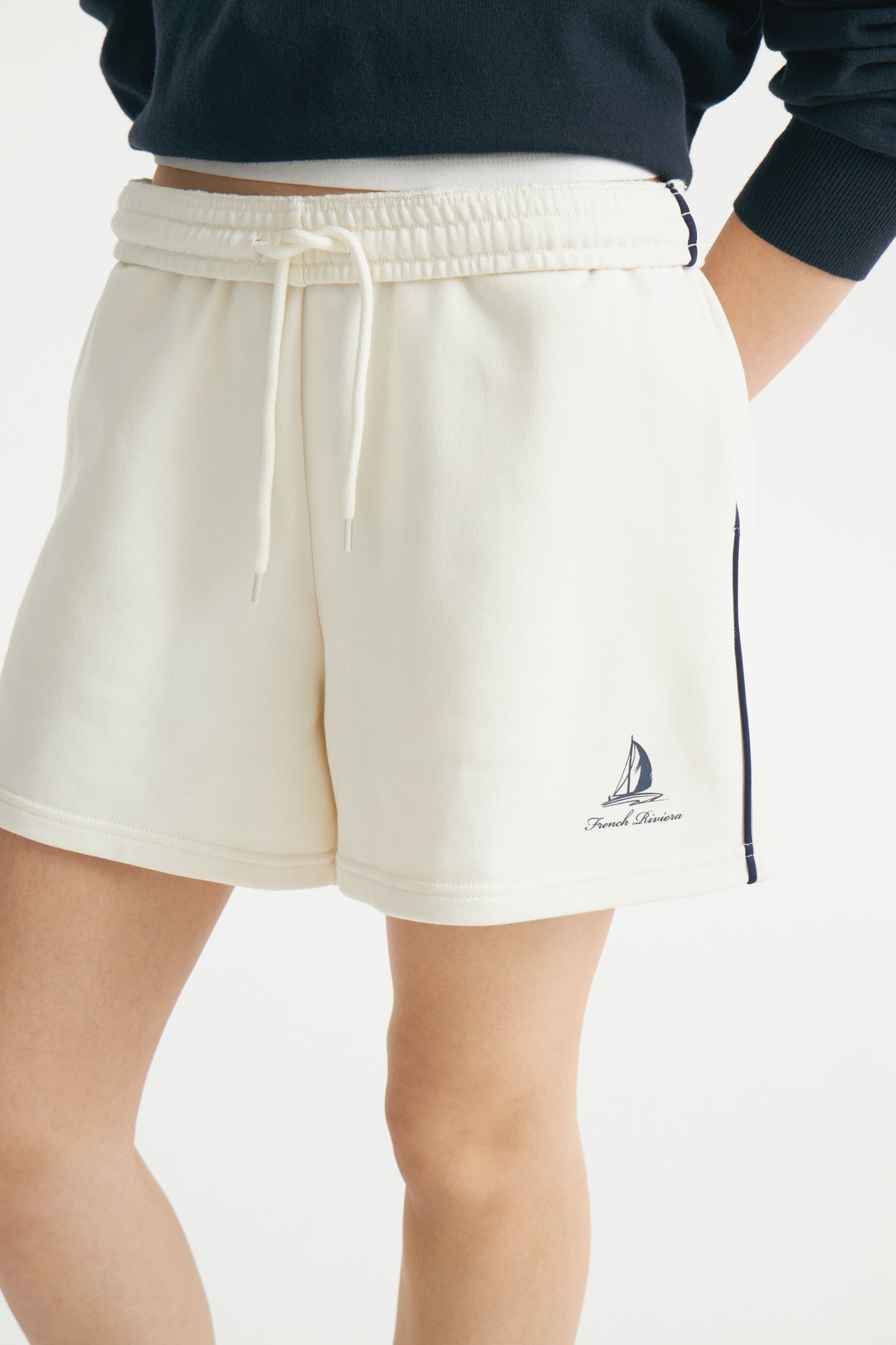 Shorts in a sweatshirt fabric made from cotton. Wide-leg design with an elasticated waist and front pockets. Feature a contrast trims and print motif on the front.