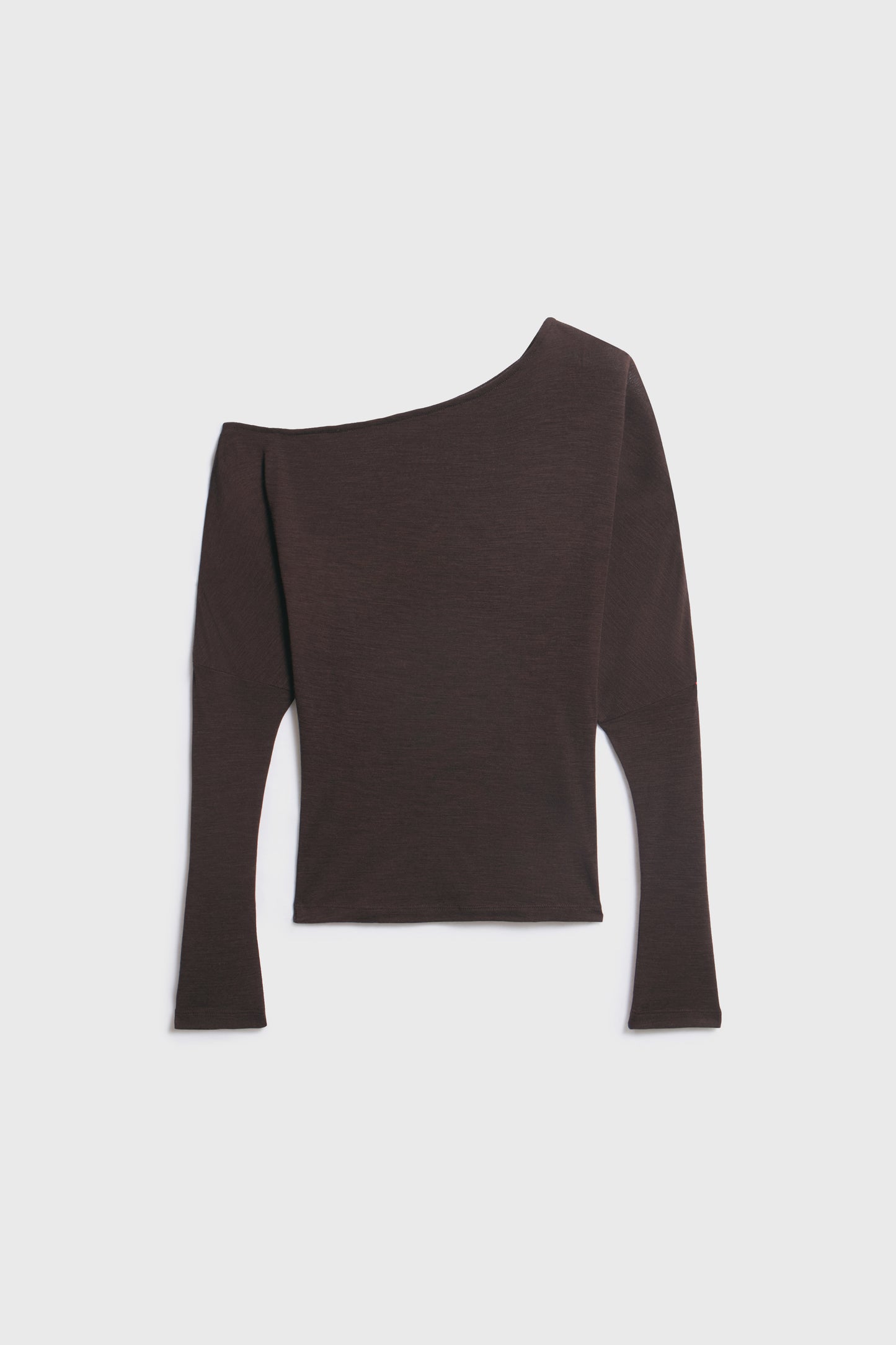 Fitted one-shoulder top in wool blend jersey with an asymmetric neckline. One wide shoulder strap.